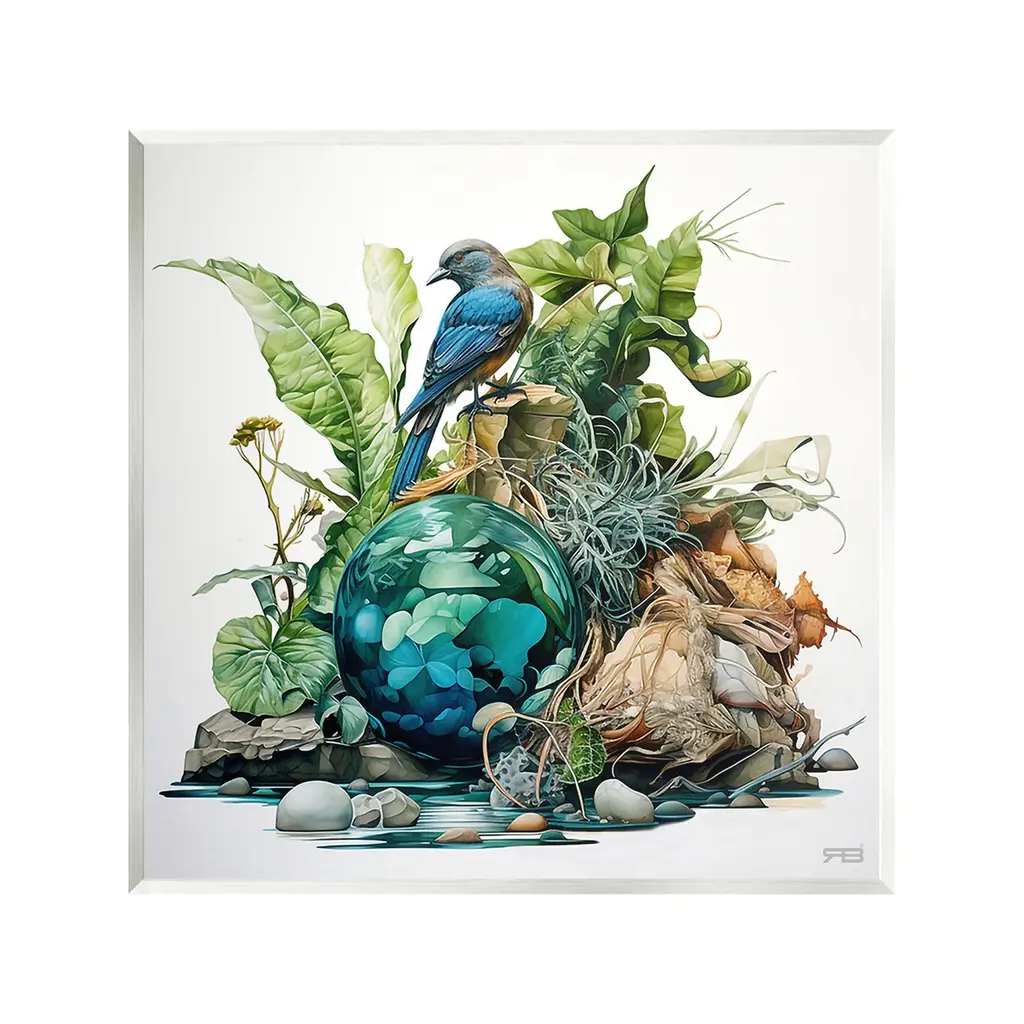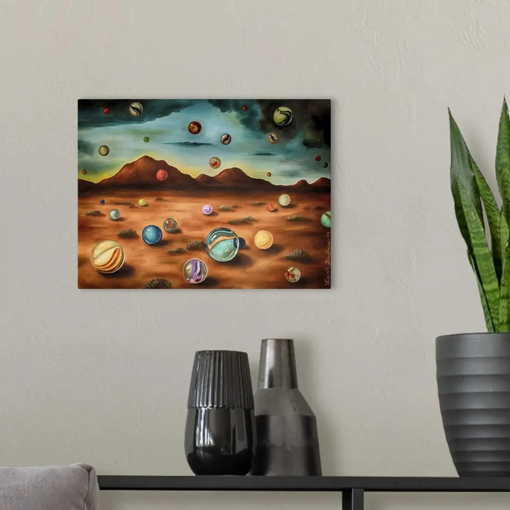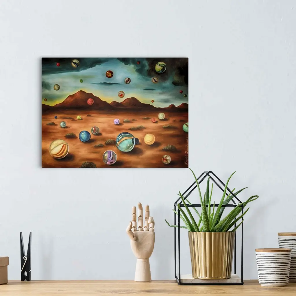 Surrealist painting of a desert landscape with marbles raining down from the sky.