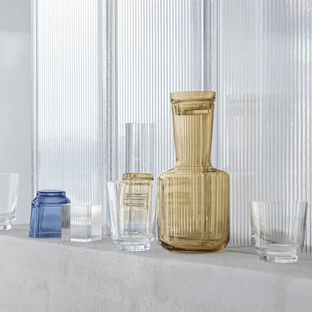 Shaped to allow for easy filling and pouring, use this sculptural vessel to serve water or juice—or to decant a special bottle of wine. Made of mouth-blown glass in a choice of clear, burnt orange or dark blue, Raise Carafe was inspired by objects seen in modernist still life paintings. Designed by Broberg & Ridderstråle for Muuto, it's a functional accompaniment for the dining table, workspace or bedside. Not suitable for hot liquids.