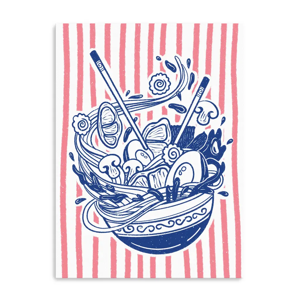 Celebrate the art of comfort food with this vibrant canvas featuring a steaming bowl of ramen, rich with noodles, eggs, and mushrooms. The bold red-and-white striped background adds a pop of retro flair to kitchens and dining spaces Our Gallery Wrap Canvas Prints are proudly assembled with high quality materials in California, USA. Each piece is printed on a thick, archival grade canvas using Giclee technology. It is then hand-stretched by our experienced artisans over solid wood bars, which will not warp over time. The final product is a piece personally crafted for you to confidently display on your wall. Care and Assembly: Ensure that the location of your piece has little to no exposure to heat, sunlight, and moisture. Wipe clean, only if needed. Each piece includes hanging hardware to hang on your wall vertically.