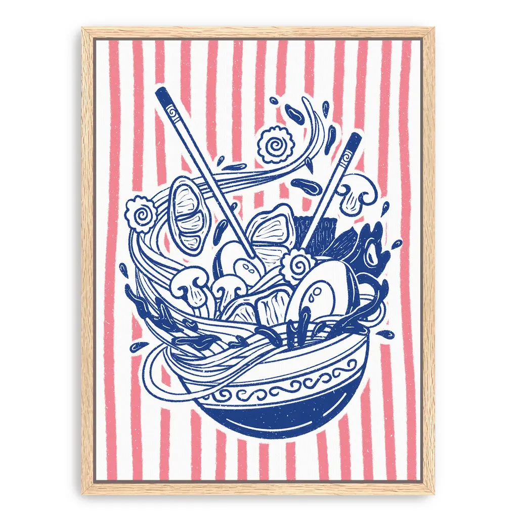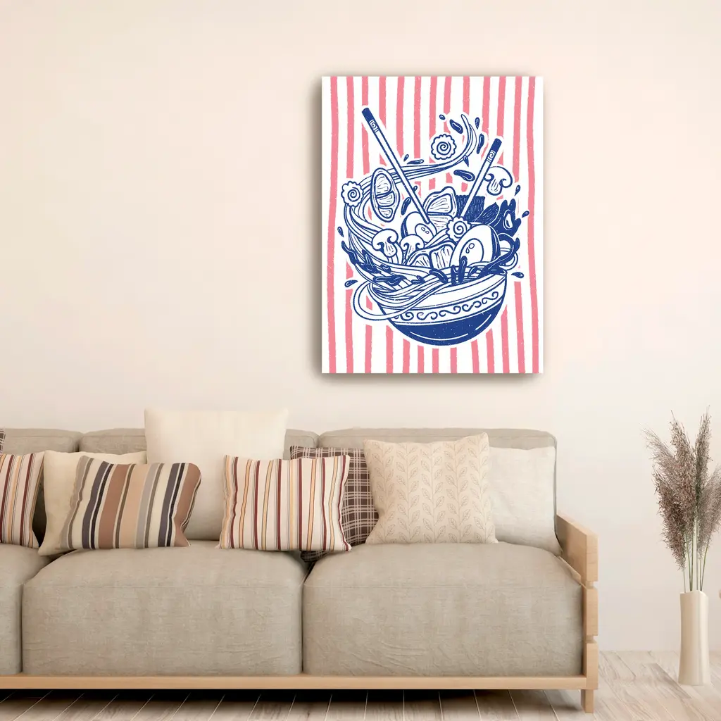 Celebrate the art of comfort food with this vibrant canvas featuring a steaming bowl of ramen, rich with noodles, eggs, and mushrooms. The bold red-and-white striped background adds a pop of retro flair to kitchens and dining spaces Our Gallery Wrap Canvas Prints are proudly assembled with high quality materials in California, USA. Each piece is printed on a thick, archival grade canvas using Giclee technology. It is then hand-stretched by our experienced artisans over solid wood bars, which will not warp over time. The final product is a piece personally crafted for you to confidently display on your wall. Care and Assembly: Ensure that the location of your piece has little to no exposure to heat, sunlight, and moisture. Wipe clean, only if needed. Each piece includes hanging hardware to hang on your wall vertically.
