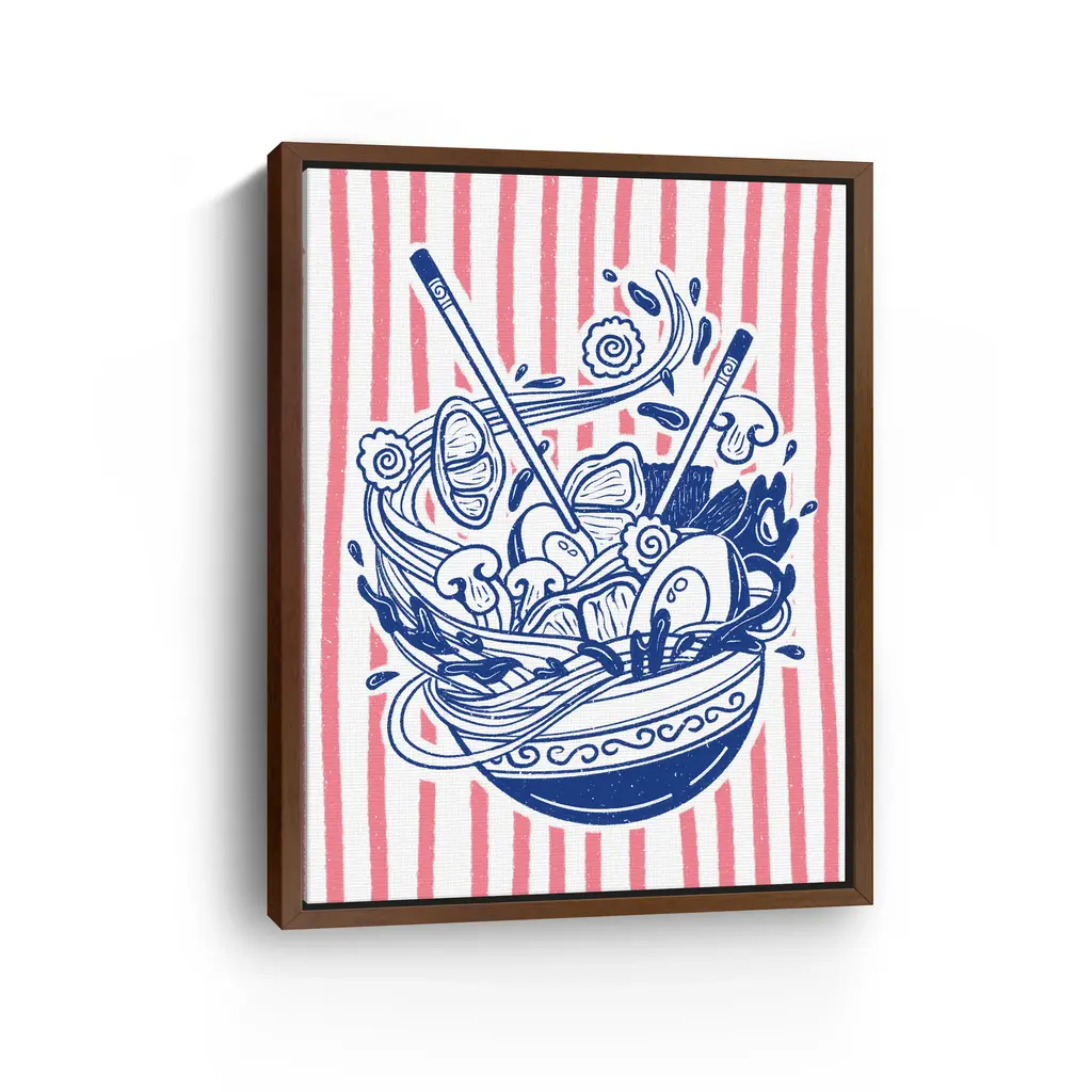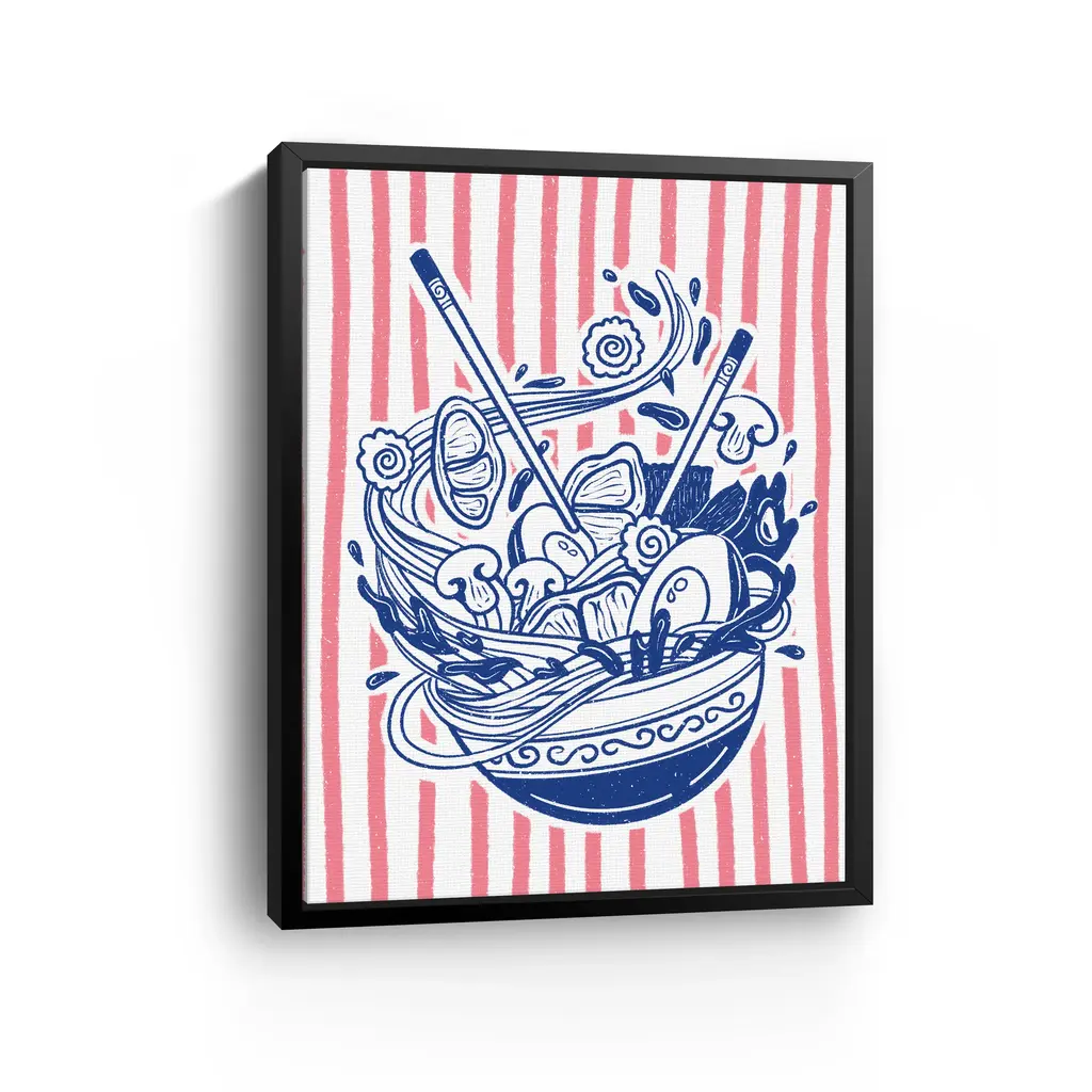 Celebrate the art of comfort food with this vibrant canvas featuring a steaming bowl of ramen, rich with noodles, eggs, and mushrooms. The bold red-and-white striped background adds a pop of retro flair to kitchens and dining spaces Our Gallery Wrap Canvas Prints are proudly assembled with high quality materials in California, USA. Each piece is printed on a thick, archival grade canvas using Giclee technology. It is then hand-stretched by our experienced artisans over solid wood bars, which will not warp over time. The final product is a piece personally crafted for you to confidently display on your wall. Care and Assembly: Ensure that the location of your piece has little to no exposure to heat, sunlight, and moisture. Wipe clean, only if needed. Each piece includes hanging hardware to hang on your wall vertically.
