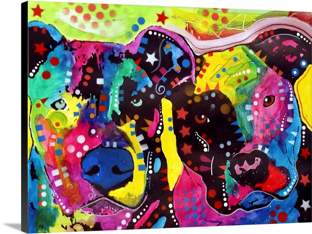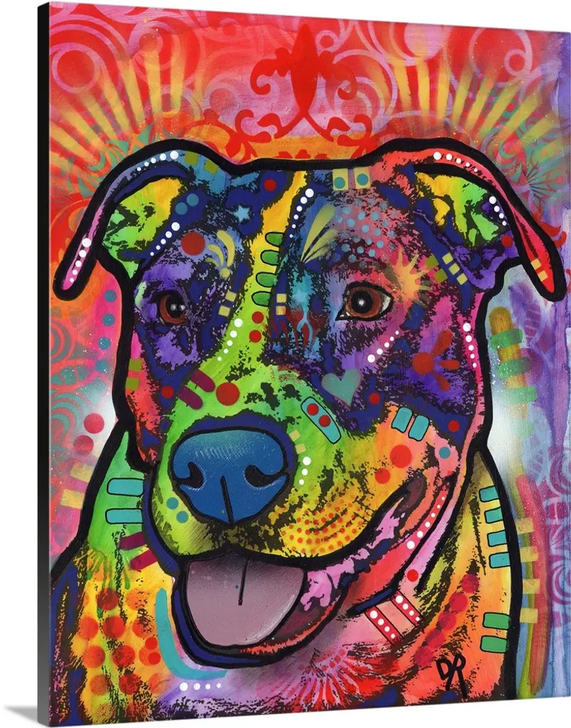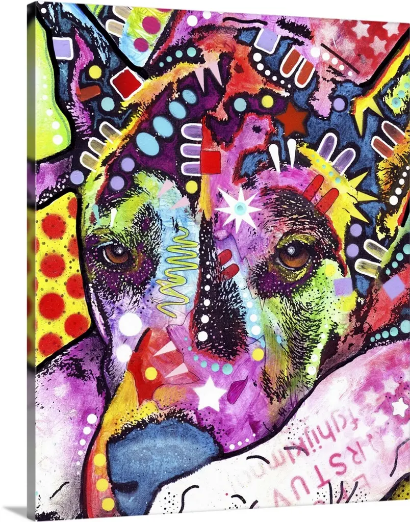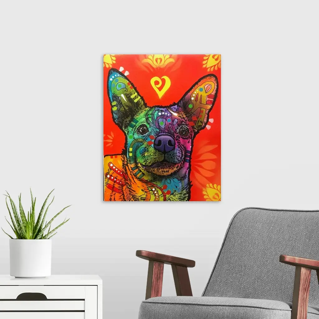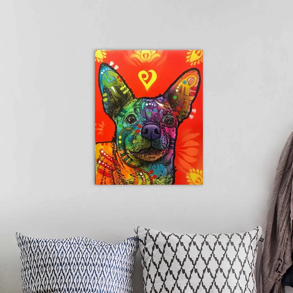 Contemporary stencil painting of a chihuahua filled with various colors and patterns.