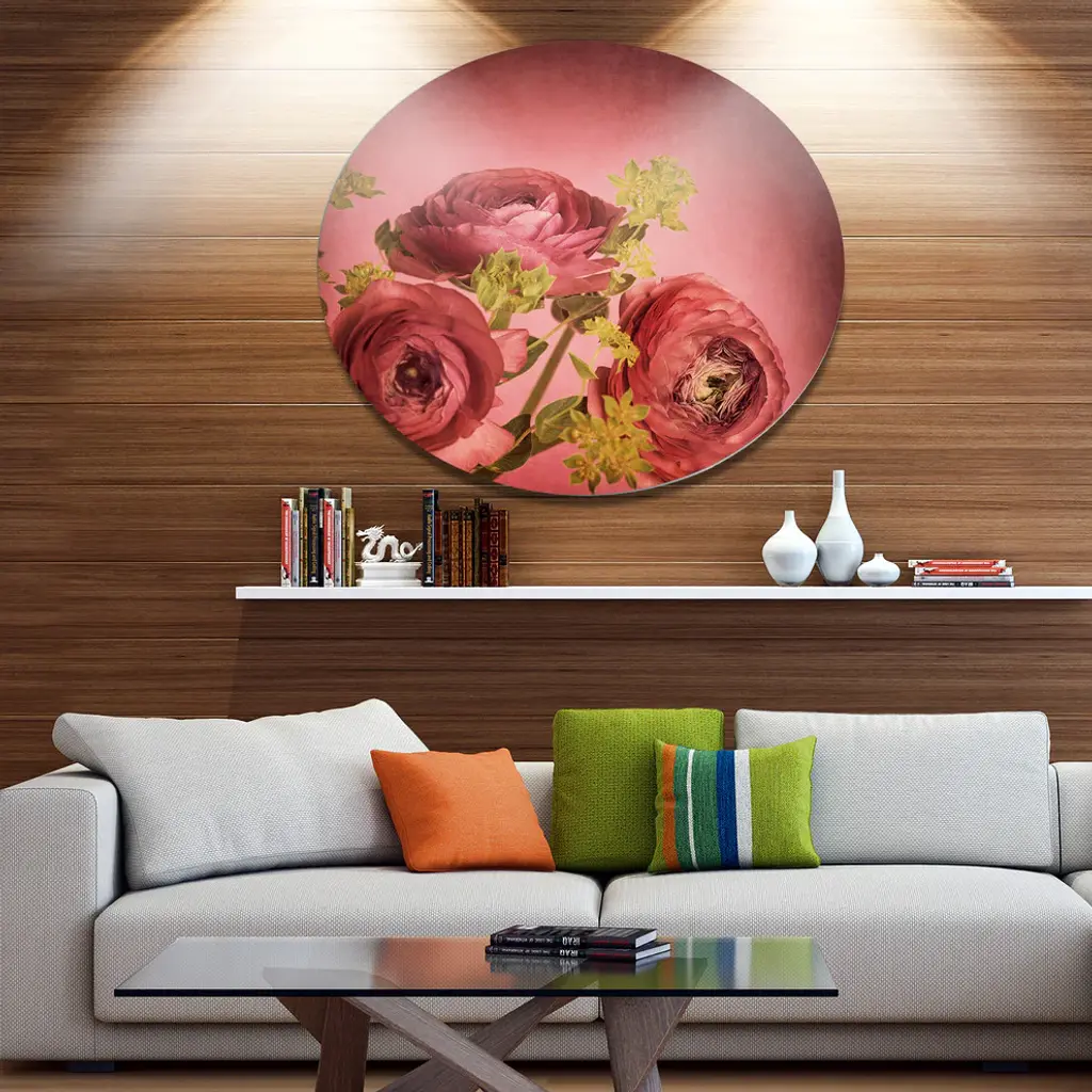 Ranunculus Flowers Stem On Pink, Floral Disc Metal Artwork, 11"