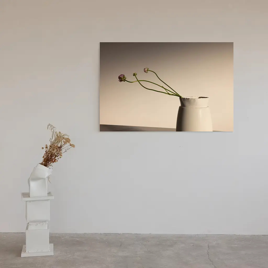The Ranunculus in Breganze is a limited-edition photograph that blends natural beauty with artistic expression. A pigment print on Fine Art paper, mounted on dibond and unframed, it includes a Certificate of Authenticity. Part of the Break the Mold project, it reflects on the contrast between mass production and craftsmanship, inspired by the artist’s grandfather’s hometown, Nove di Bassano, Italy. The image features asymmetrical ceramic vases, evoking classical aesthetics and creating the illusion of objects emerging from the frame.A meditation on imperfection and transience, this striking piece captures both fragility and resilience, making it a compelling addition to any collection.