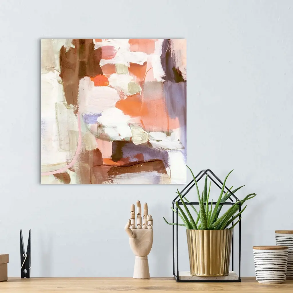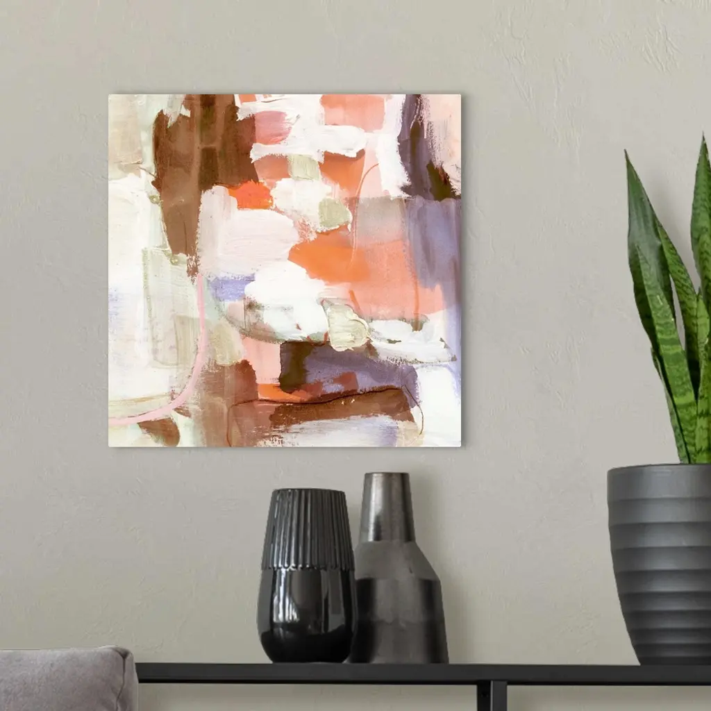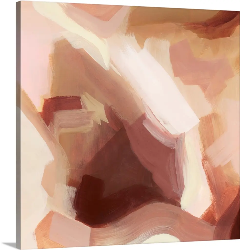 Square abstract painting in shades of brown, orange, pink, purple and cream.