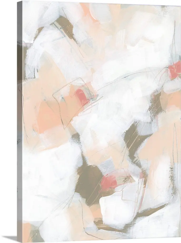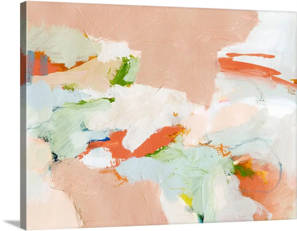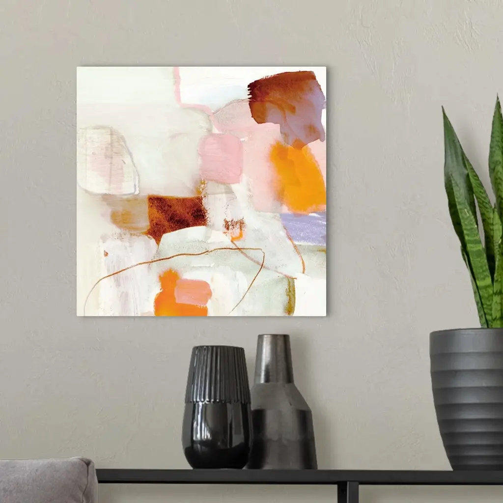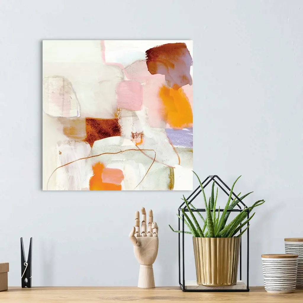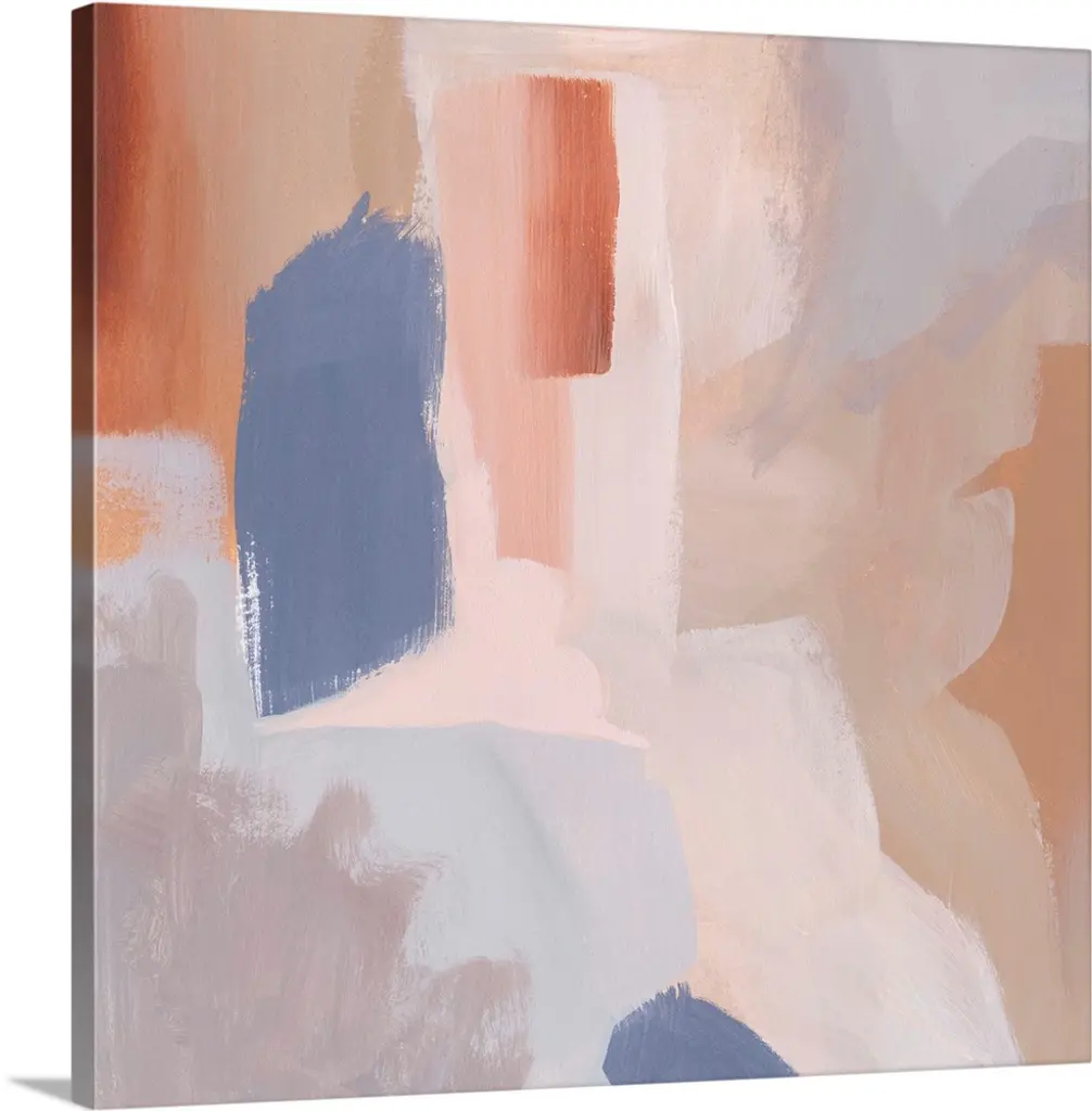 Square abstract painting in shades of brown, orange, pink, purple and cream.