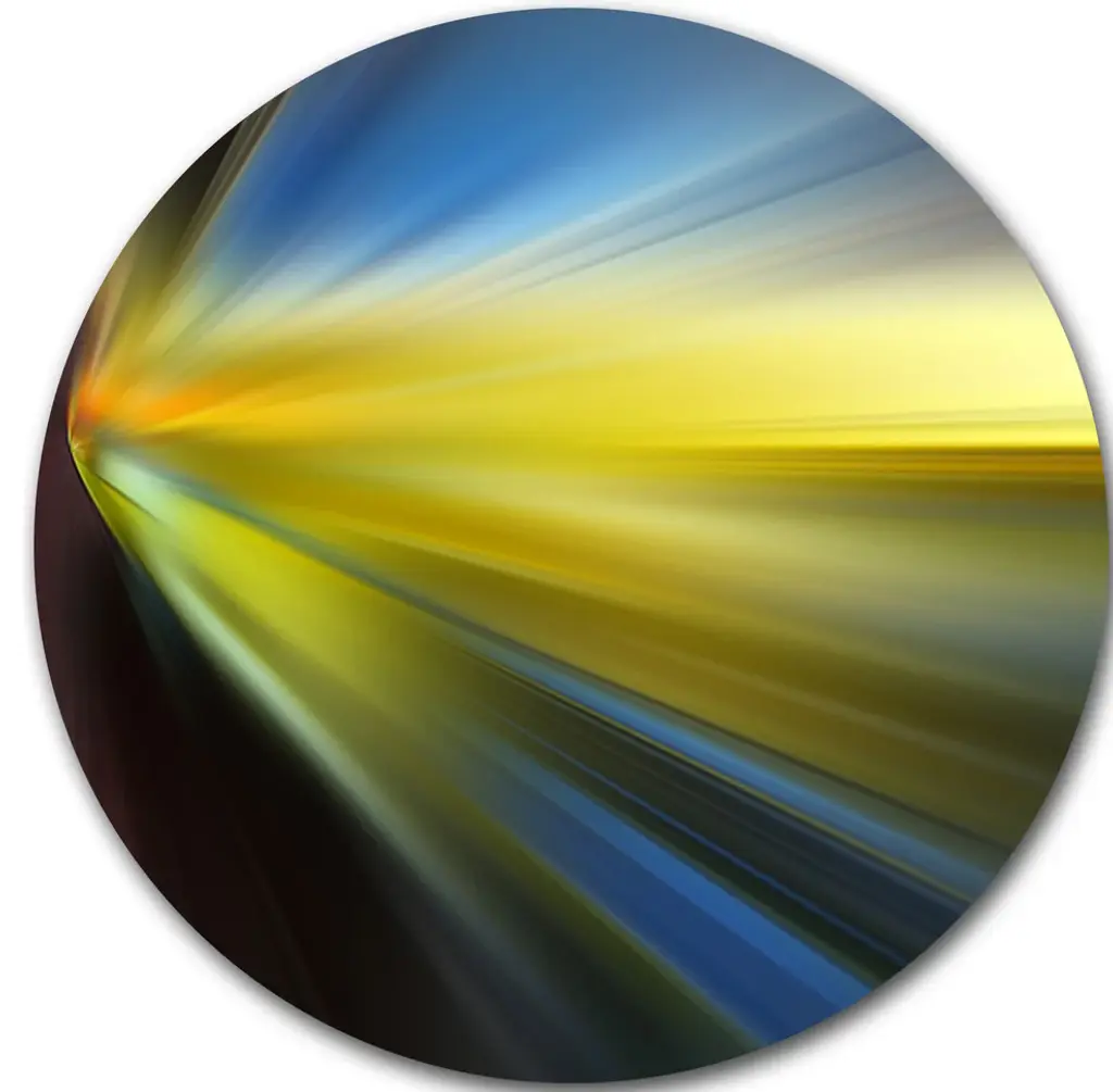 Bring Contemporary Abstraction to your home with this large Circle Metal wall art. This Rays of Speed Reflection Metal Artwork makes it the focal point of any room or office. - White Gloss Coating ensures colors are extra vibrant with light reflection.- Aluminum grade Sheet Metal with 1 inch mounting frame on the back giving the illusion that the artwork is floating on the wall..- Mounting Brackets are included along with instructions.- High Quality Digital images are created directly into a glossy aluminum panel producing a stunning and captivating print into the glossy finish of the metal.- Water, Fire and Scratch resistant HD Aluminum panels.- Looks better than any photo paper and guaranteed to last at least 20 years- Easy to clean with a microfiber cloth. Colors are far superior to regular Canvas Art. - Easy to Hang