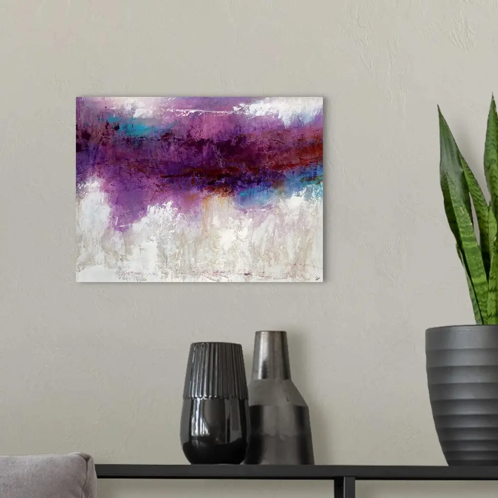 Abstract artwork consisting of a bright purple mass over a cool, neutral background.