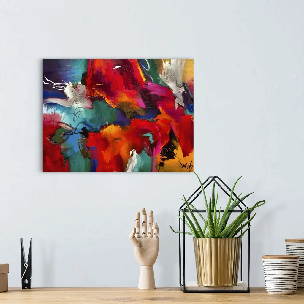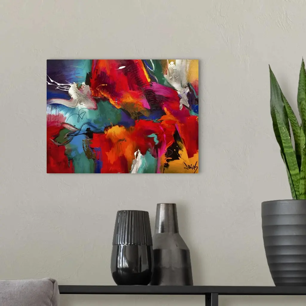 Contemporary abstract painting using wild and vivid colors to create movement and depth.