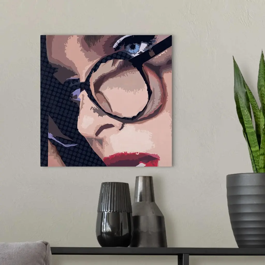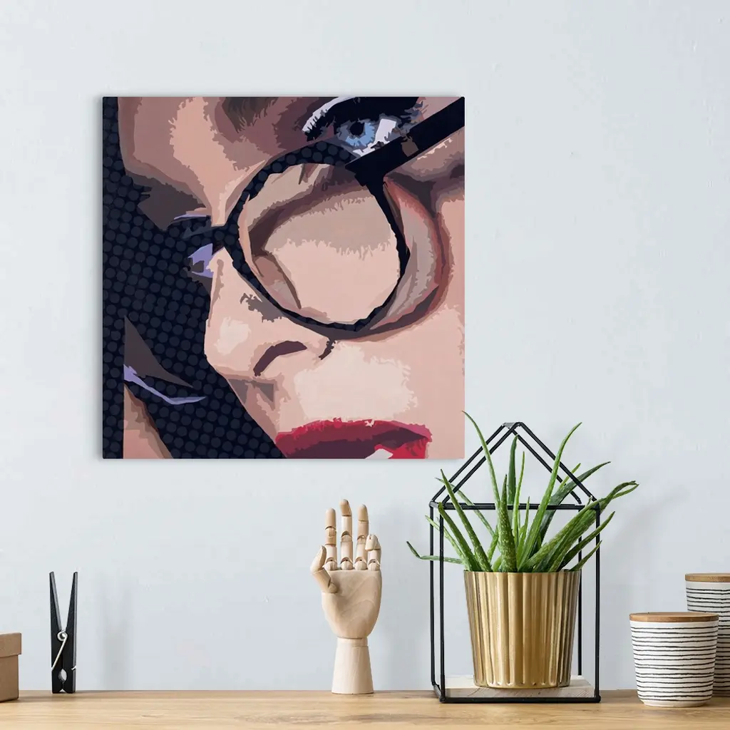 Close-up square artwork of a woman wearing glasses on a polka dotted background.