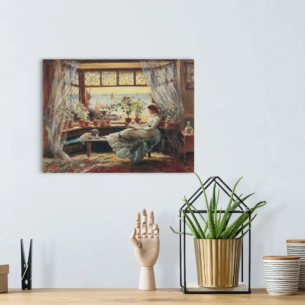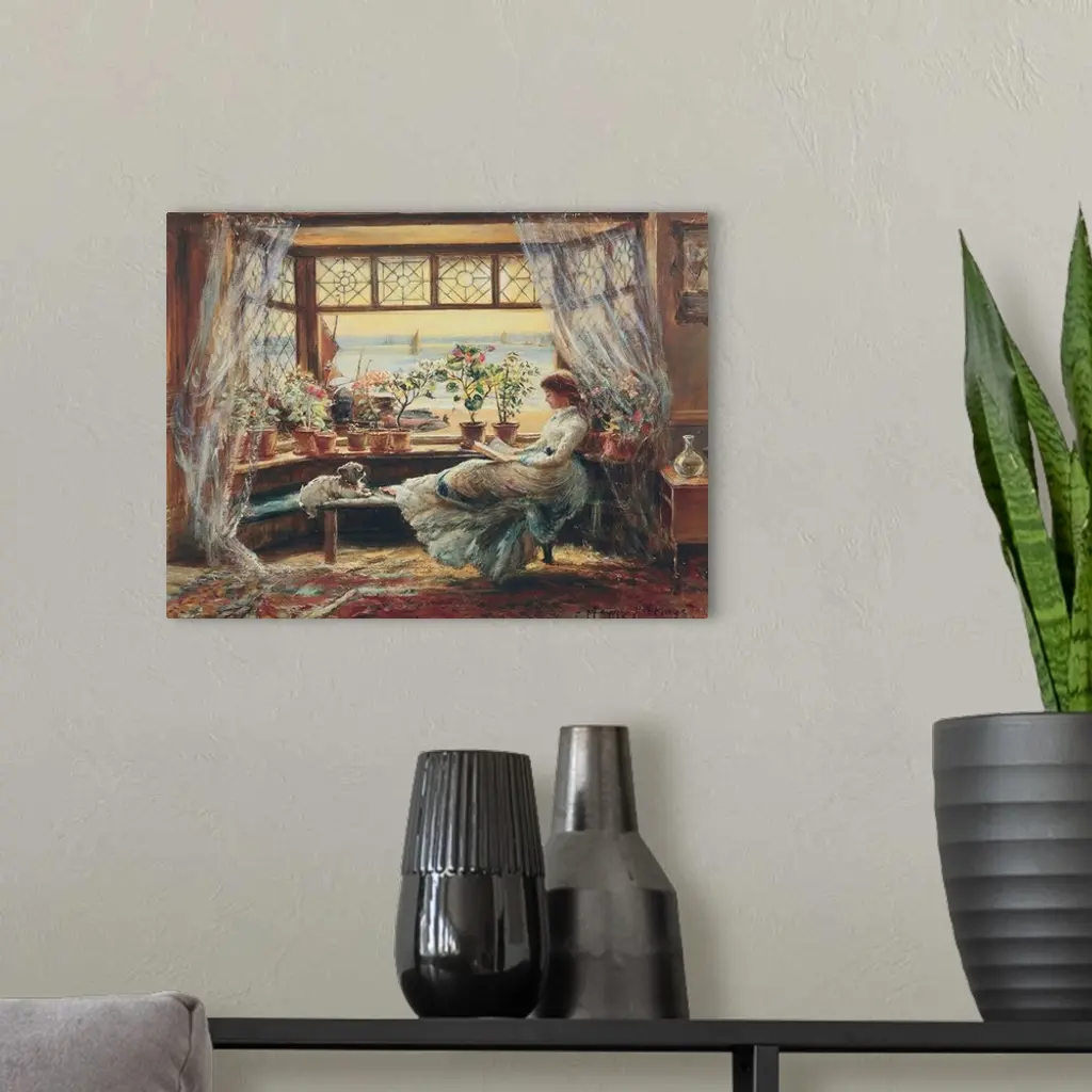 Classic painting of a woman reading at a bay window with her dog.