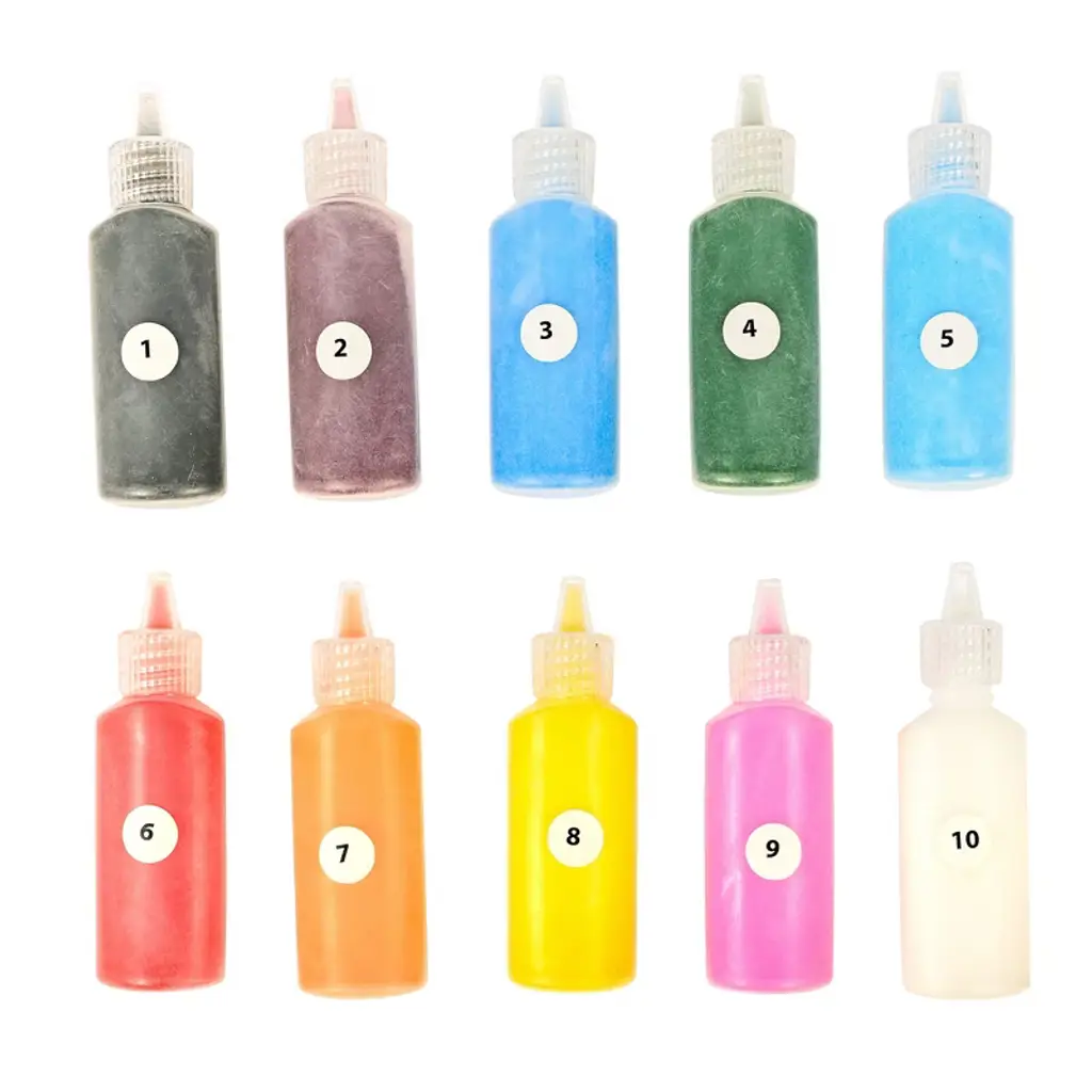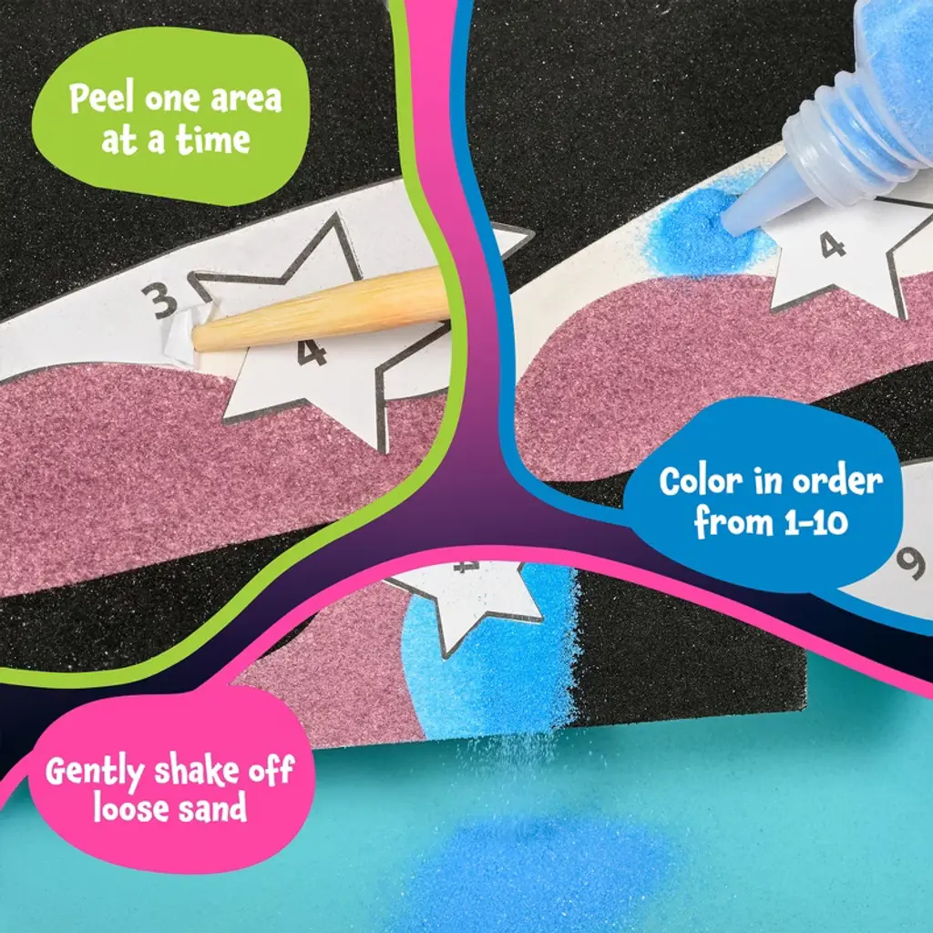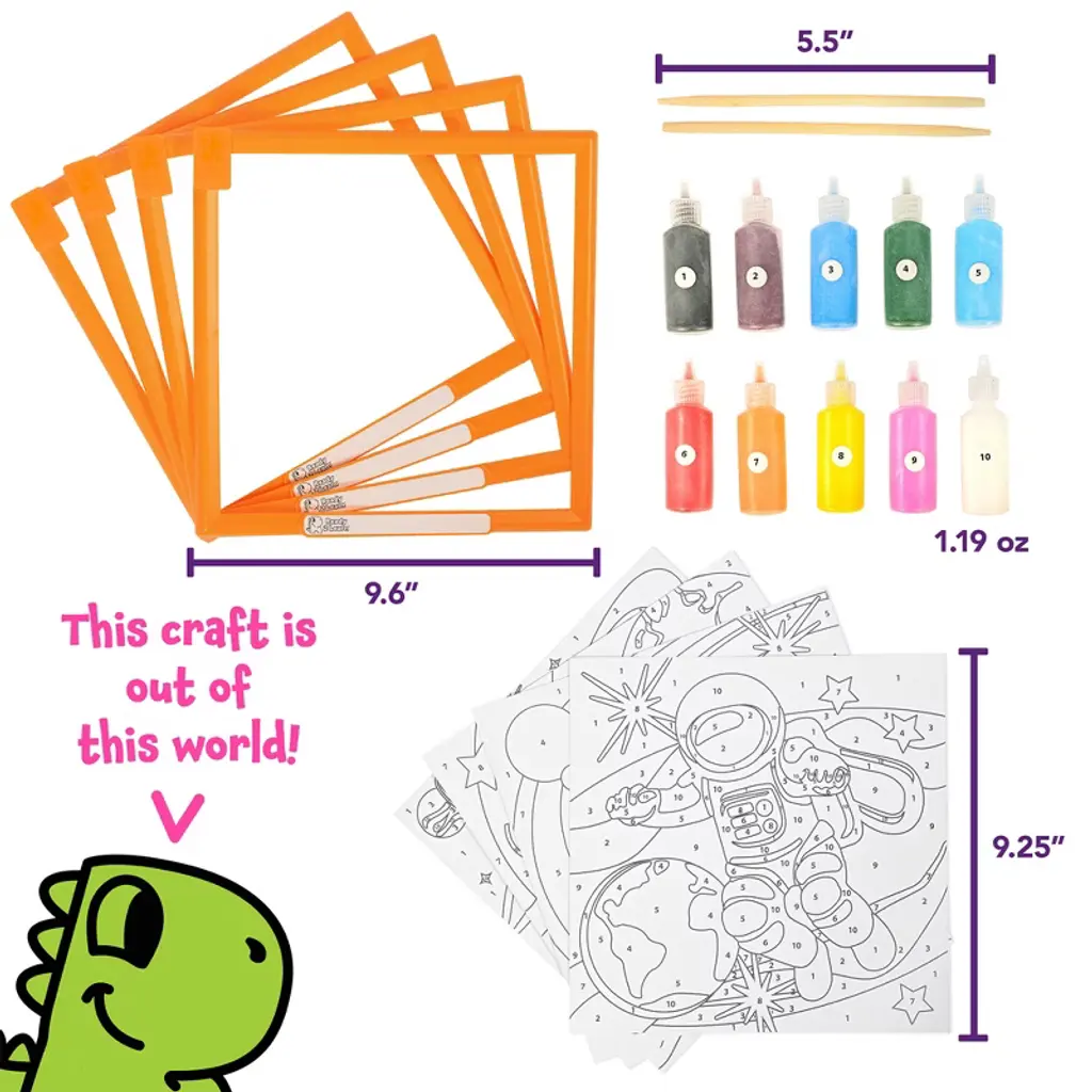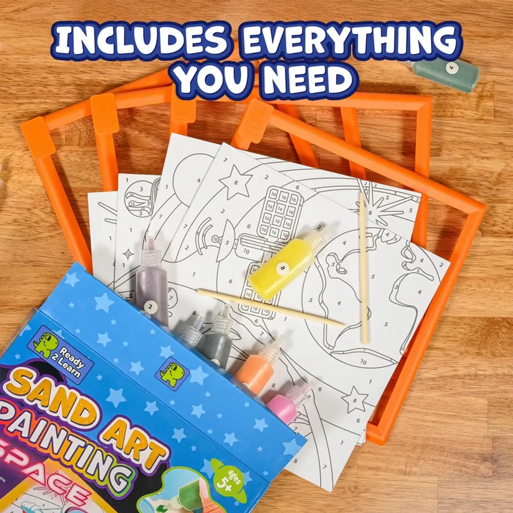 READY 2 LEARN Sand Art Painting, Space | This peel and stick sand art kit includes everything you need to create four vibrant, space scenes. Use the two styluses and 10 colors of sand to complete each design. Then, frame and hang your sand art pictures for display. Promote fine motor skills and early number concepts. This color-by-number kit is ideal for playdates or arts and crafts at home. Includes 10 colors of bottled sand, 4 designs, 4 frames with name labels, 2 wooden styluses and instructions. For ages 5+. Size of design sheets: 9.25"W. Size of square frames: 9.6"W. Length of stylus: 5.5". Sand bottles are 1.19 oz.