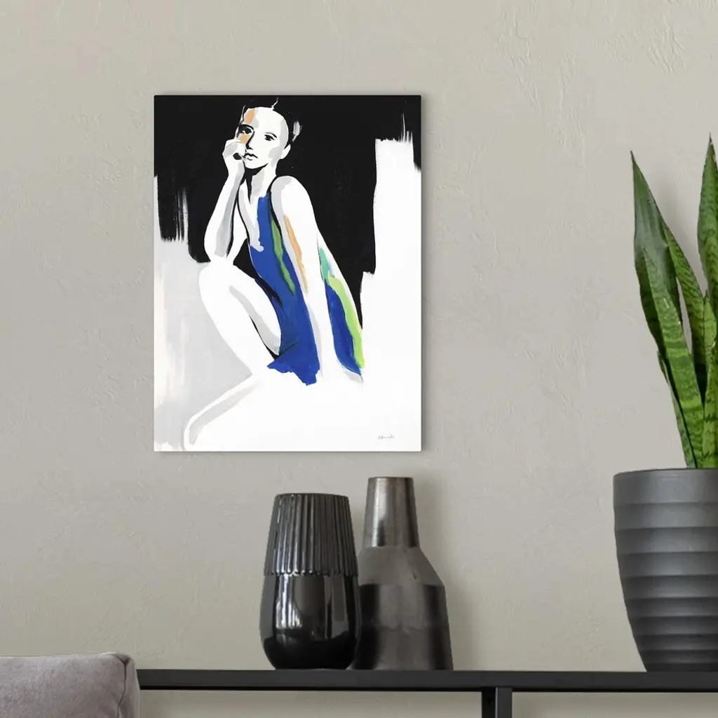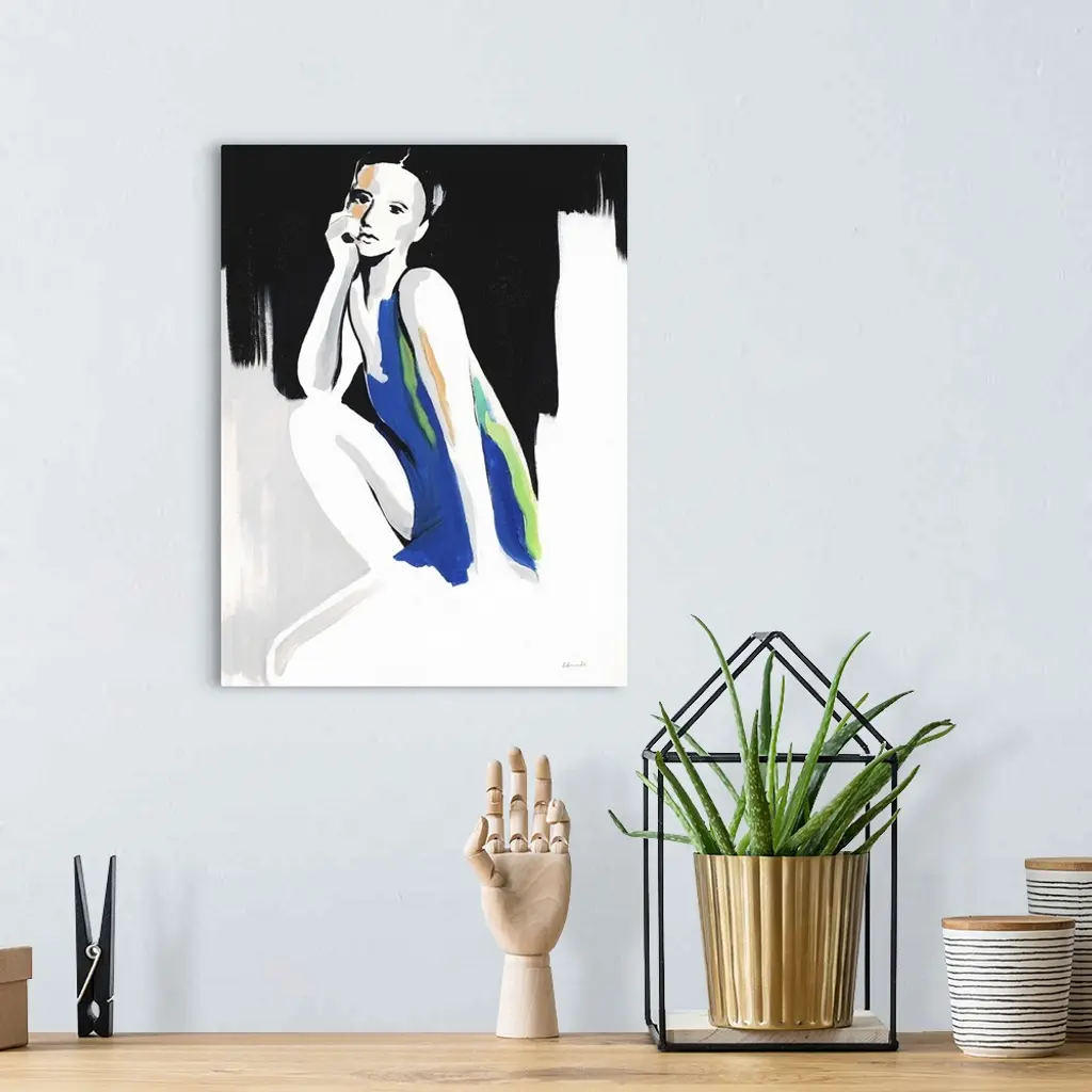 Contemporary painting of a woman wearing a blue dress against an abstract background.
