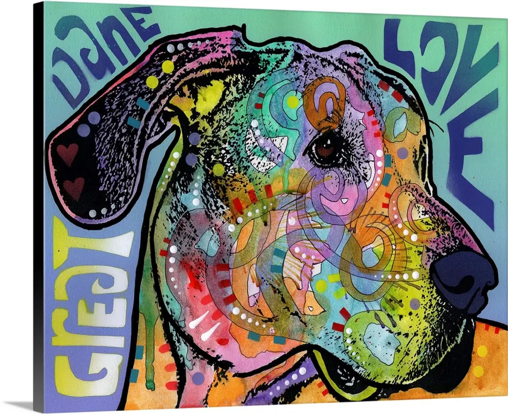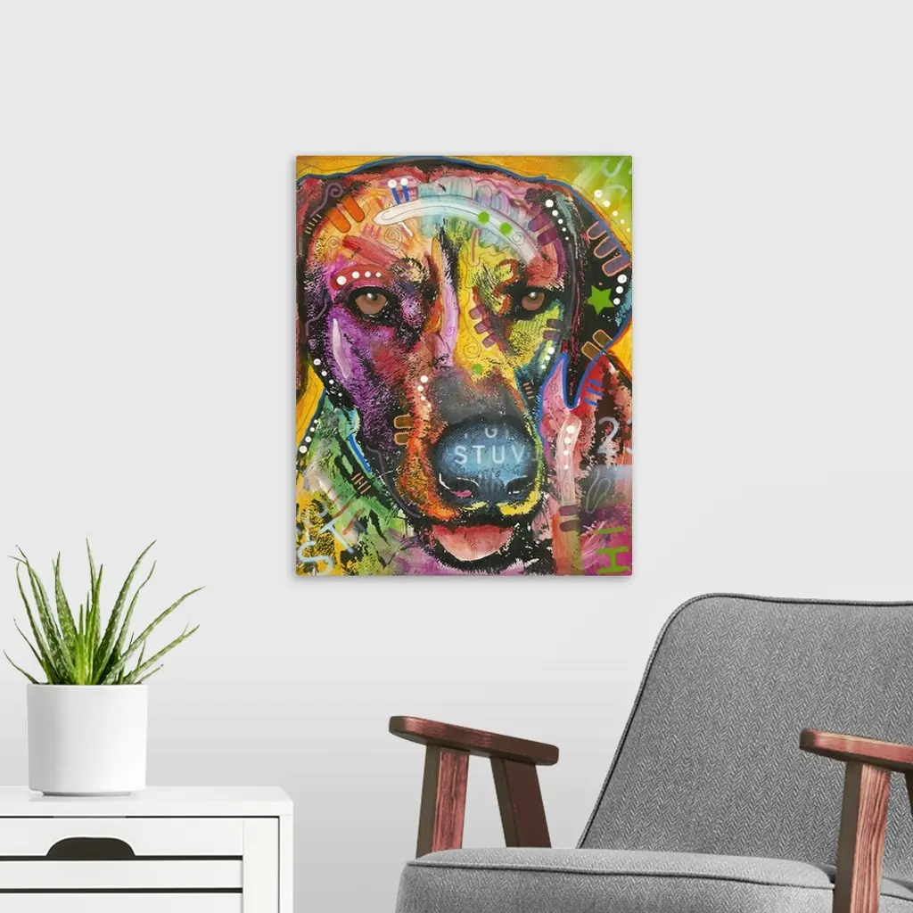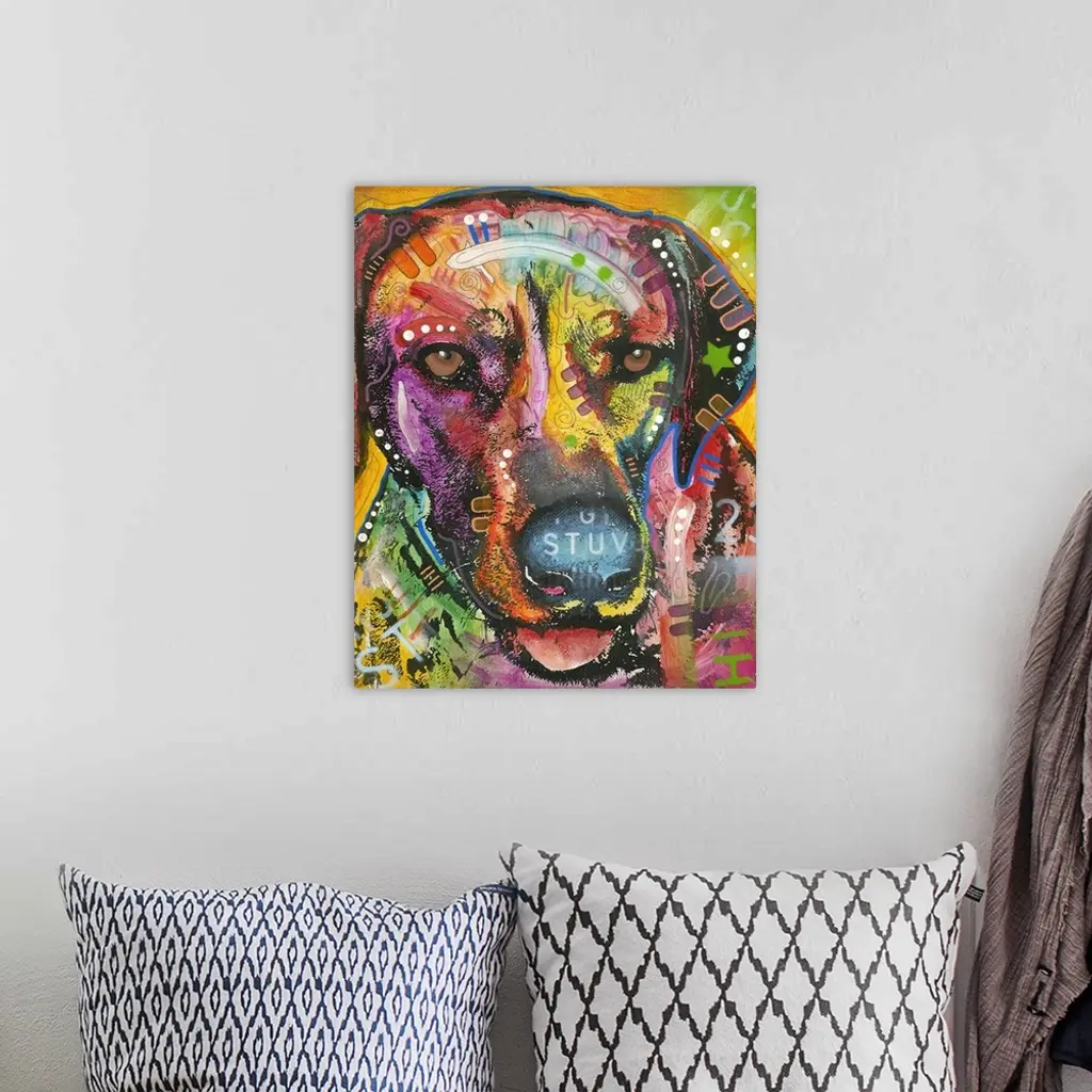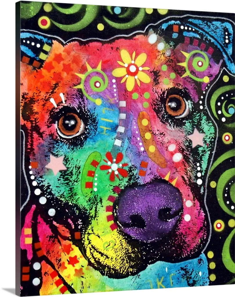 Colorful painting of a Retriever with graffiti-like designs all over.