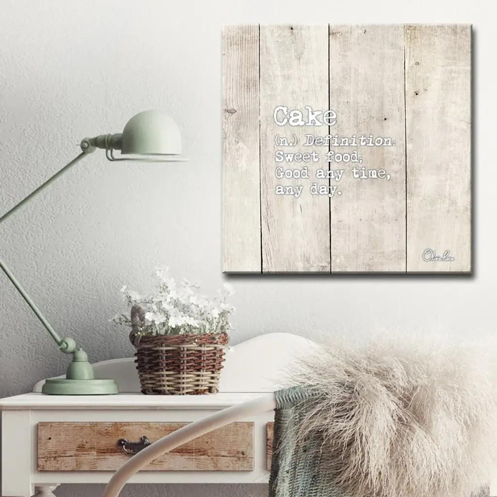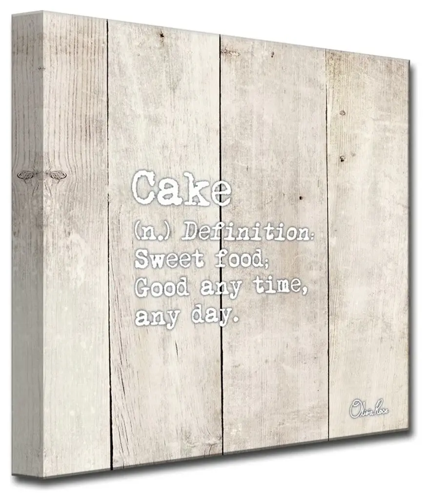Be Inspired and Inspire with Olivia Rose ''Define Cake'' Inspirational Wall Art. A simple sentiment to incorporate humor and whimsy into your space is written in this Textual Art Made in the USA by Ready2HangArt.Masterfully produced at R2H factory in Lake Worth, Florida on water resistant canvas enhanced with a matte UV-Resistant finish and skillfully wrapped on a wood frame finished with a rear saw-tooth hanger for simple install.Manufacturer: Ready2HangArtTitle: Define CakeBrand: Olivia RoseOrientation: SquareShape: SquareColors: Brown, Wood Grain, WhiteModel No. VMTQ049Sizes:1. 12 in. H x 12 in. W x 1.5 inches deep2. 16 in. H x 16 in. W x 1.5 inches deep3. 20 in. H x 20 in. W x 1.5 inches deep4. 30 in. H x 30 in. W x 1.5 inches deepReady2HangArt is an American small business, dedicated to enhancing Home Decor with innovative designs, and locally made products at a competitive value. Proudly Made in America,