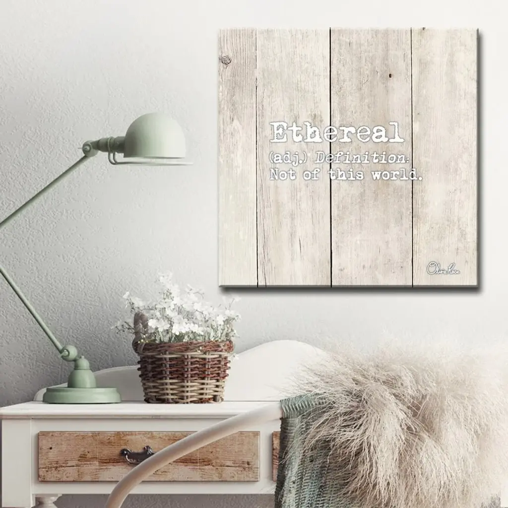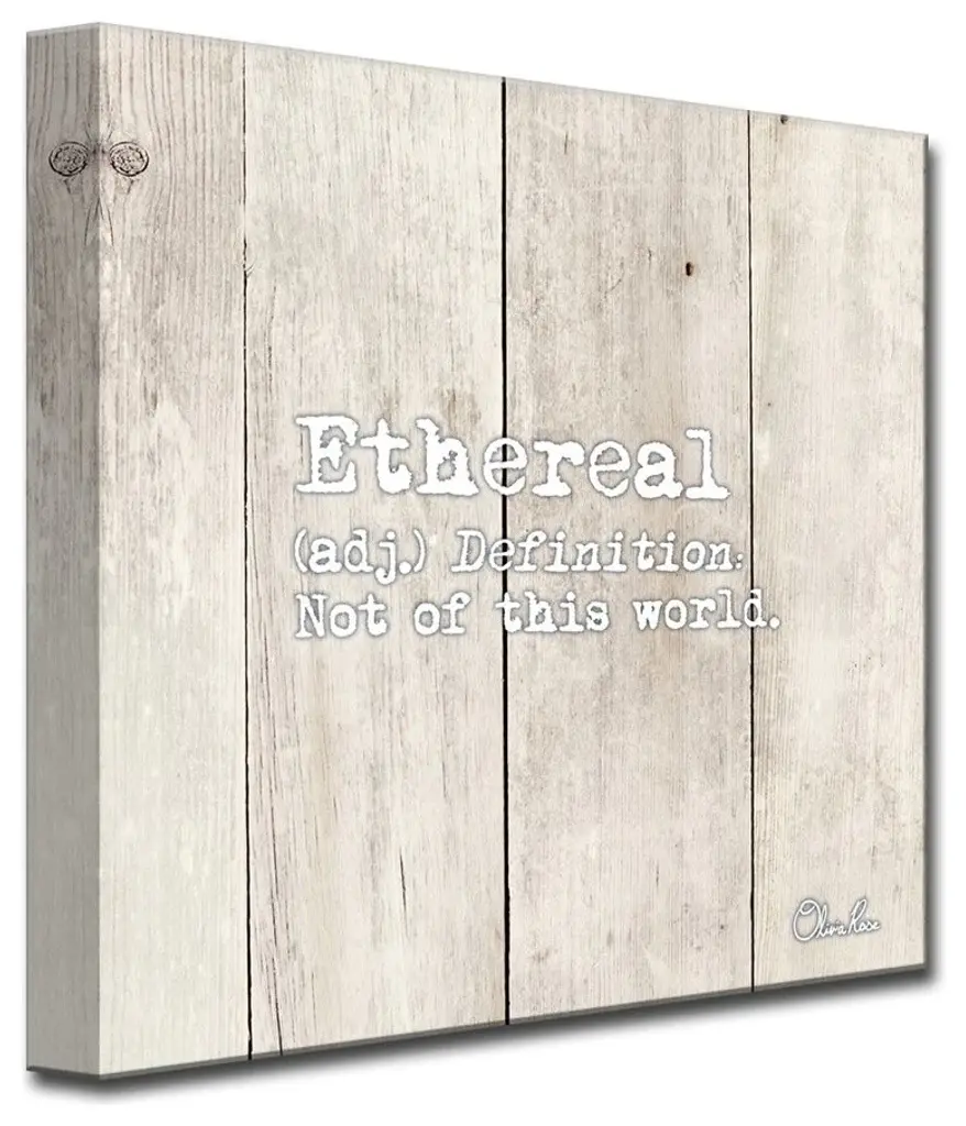 Be Inspired and Inspire with Olivia Rose ''Define Ethereal'' Inspirational Wall Art. A simple sentiment to incorporate spiritual whimsy into your space is written in this Textual Art Made in the USA by Ready2HangArt.Masterfully produced at R2H factory in Lake Worth, Florida on water resistant canvas enhanced with a matte UV-Resistant finish and skillfully wrapped on a wood frame finished with a rear saw-tooth hanger for simple install.Manufacturer: Ready2HangArtTitle: Define EtherealBrand: Olivia RoseOrientation: SquareShape: SquareColors: Brown, Wood Grain, WhiteModel No. VMTQ043Sizes:1. 12 in. H x 12 in. W x 1.5 inches deep2. 16 in. H x 16 in. W x 1.5 inches deep3. 20 in. H x 20 in. W x 1.5 inches deep4. 30 in. H x 30 in. W x 1.5 inches deepReady2HangArt is an American small business, dedicated to enhancing Home Decor with innovative designs, and locally made products at a competitive value. Proudly Made in America,