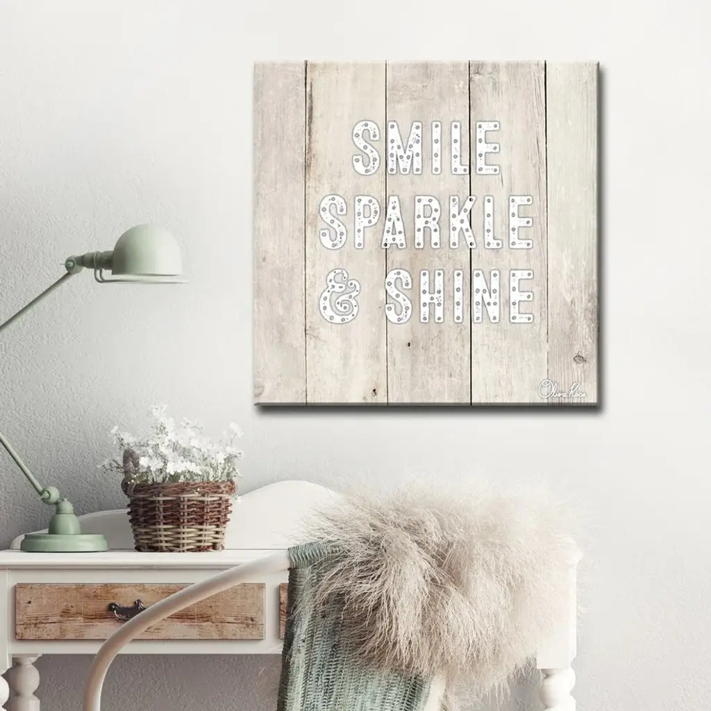 Be Inspired and Inspire with Olivia Rose ''Smile Sparkle'' Inspirational Wall Art. A simple sentiment to incorporate positivity and encouragement into your space is written in this Textual Art Made in the USA by Ready2HangArt.Masterfully produced at R2H factory in Lake Worth, Florida on water resistant canvas enhanced with a matte UV-Resistant finish and skillfully wrapped on a wood frame finished with a rear saw-tooth hanger for simple install.Manufacturer: Ready2HangArtTitle: Smile SparkleBrand: Olivia RoseOrientation: SquareShape: SquareColors: Brown, Wood Grain, WhiteModel No. VMTQ064Sizes:1. 12 in. H x 12 in. W x 1.5 inches deep2. 16 in. H x 16 in. W x 1.5 inches deep3. 20 in. H x 20 in. W x 1.5 inches deep4. 30 in. H x 30 in. W x 1.5 inches deepReady2HangArt is an American small business, dedicated to enhancing Home Decor with innovative designs, and locally made products at a competitive value. Proudly Made in America,