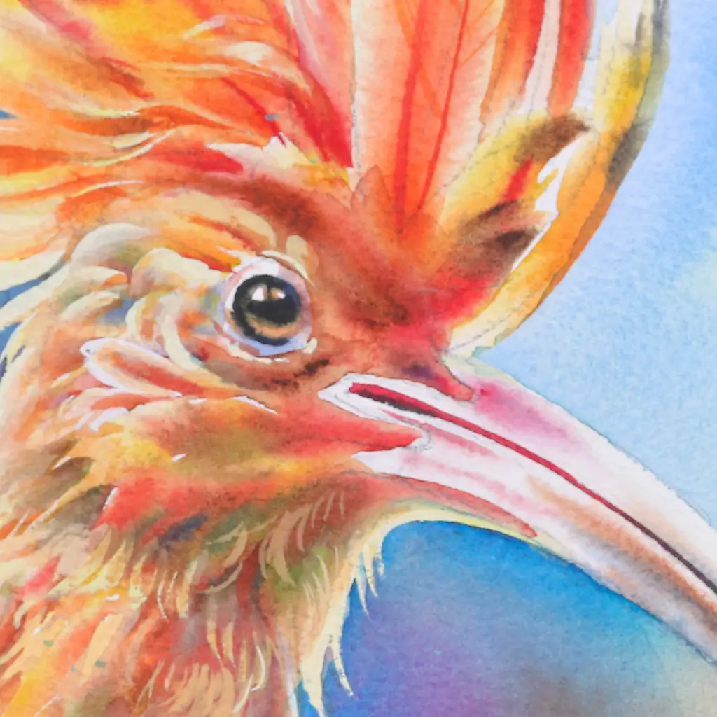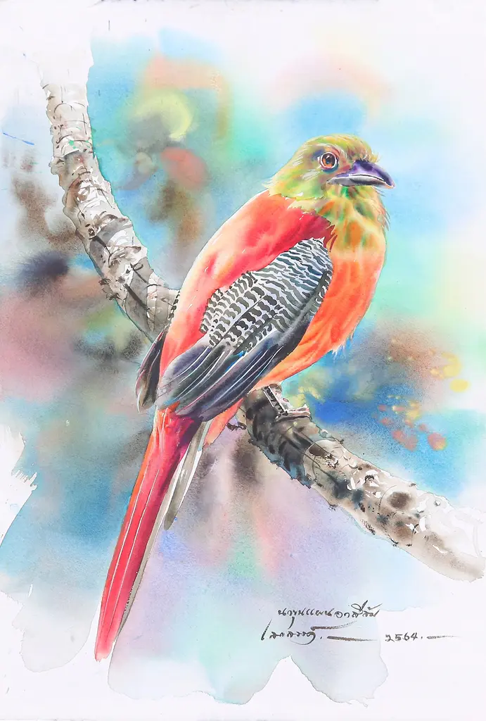 This mesmerizing watercolor composition by Seksan Sing-on takes its cue from the stunning splendor of his native Thailand's Doi Inthanon National Park and its diverse wildlife. Sing-on's serendipitous sighting of the Eurasian hoopoe through the lens of a photographer catalyzed the creation of this remarkable artwork. With consummate skill and a commitment to realism, the artist meticulously imbues every aspect of the bird's majestic aura onto the Arches paper, culminating in a genuine masterpiece.