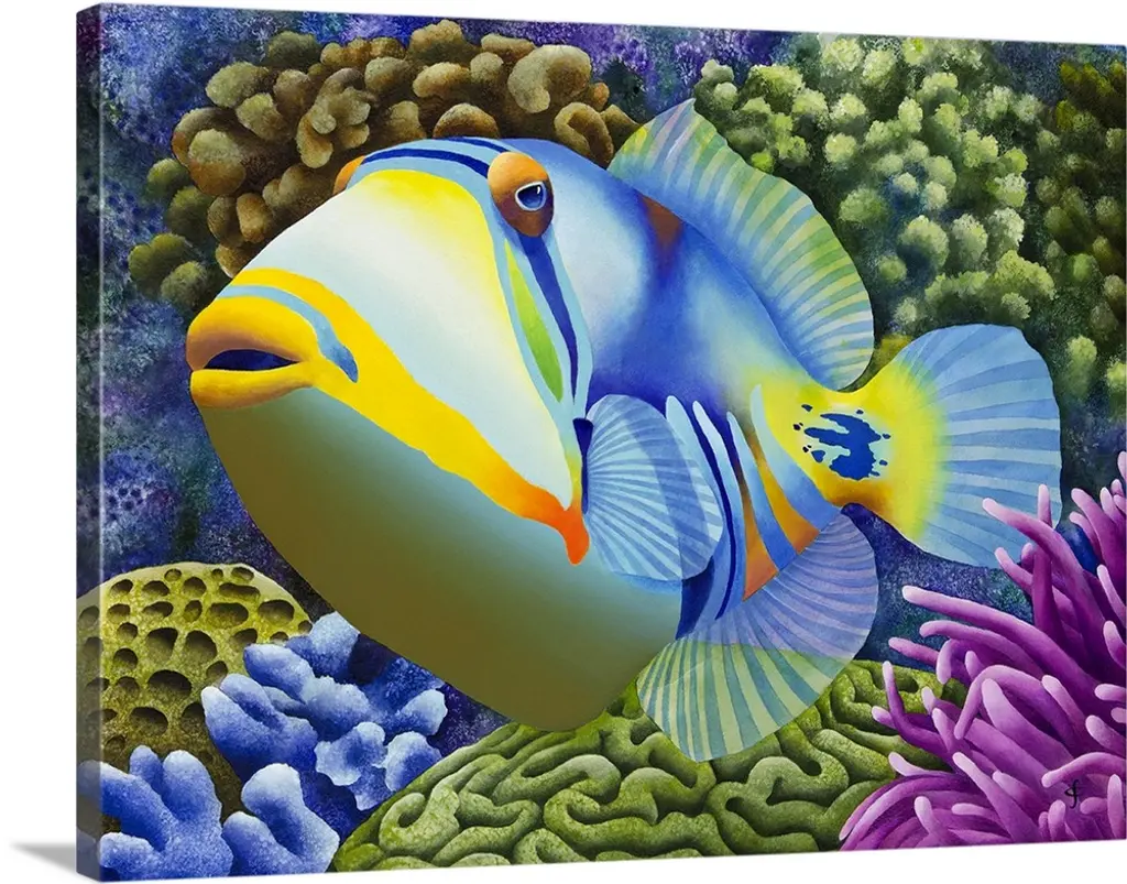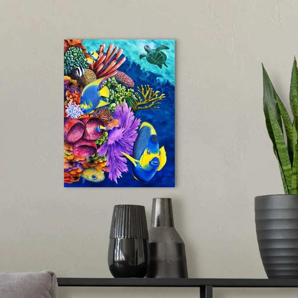 Tropical themed artwork using bright vivid colors to depict the flowers and animals of the environment.