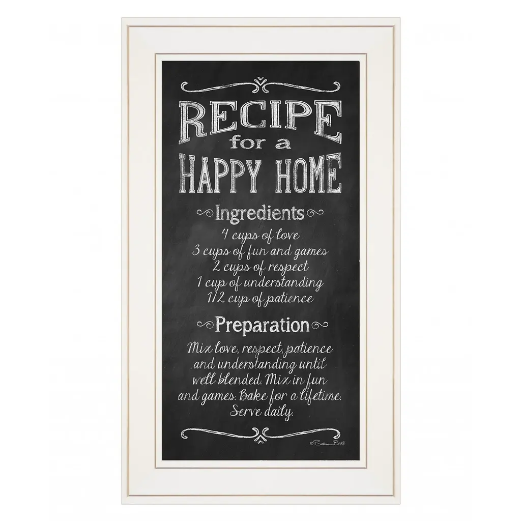 Unique and decorative, this recipe for a happy home 1 white framed print wall art will leave a lasting impression. This print is a visual artistic expression that allows you to decorate your space in style. Reproduced for you on wood, this hanging decorative accent will be a trendy and fashionable way to dress your walls in a rustic and modern farmhouse vibe. Hang on your wall to add some up to date fashion and decoration. Instantly liven up your space with this art that brings color and dimension to your walls. 21" H x 12" W x 1" D