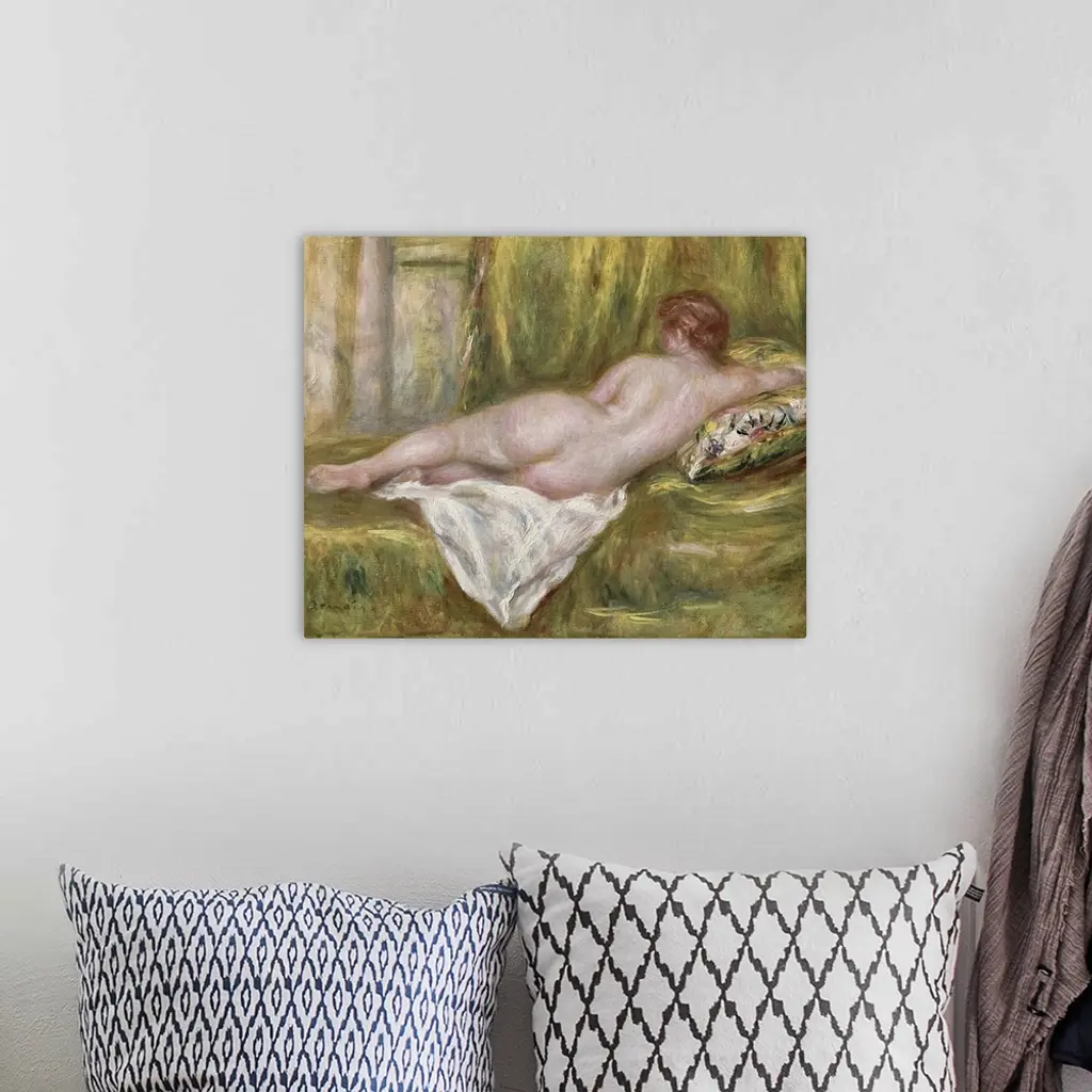 Landscape classic painting of the back of a nude woman as she lays on her side on a blanketed surface, he arm propped on a decorative pillow.