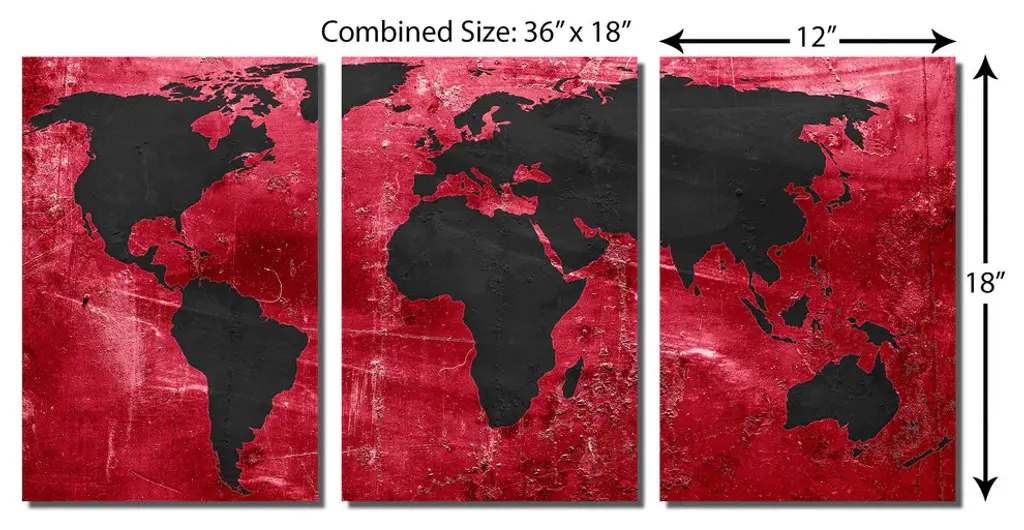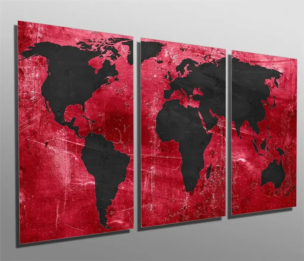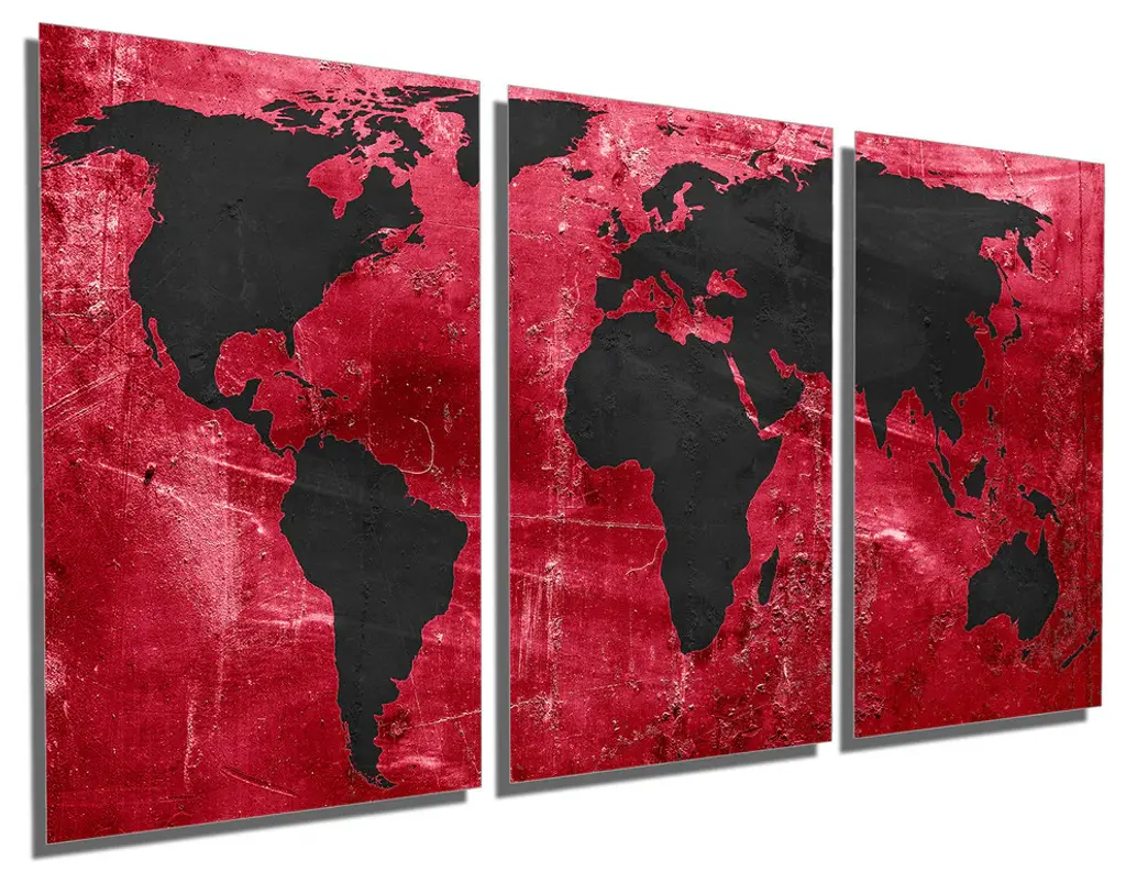 36"œ x 18"œ total size. Ready To Hang! (3 pieces - 12"œ x 18"œ each). 3 Panel Split (Triptych) Abstract art World Map Metal Print ft. shades of deep red and black colors. Modern metal wall art for home or office wall decor & interior design. Printed on Luxurious, HD aluminum glossy metal panels. Multi panel art.. HD aluminum panels. Metal print wall art. Includes Shadow Wall Mount on the back.• Aluminum Metal Wall Art• Made in USA• Ready to hang - No assembly required• Shadow mount hardware on the back• 0.045"œ thick HD Aluminum Panels• Scratch resistant, glossy finish• Superb color clarity, luxurious prints• Epson printing process• For indoor or moisture rich environment use• Easy to clean. Gently wipe with microfiber cloth.