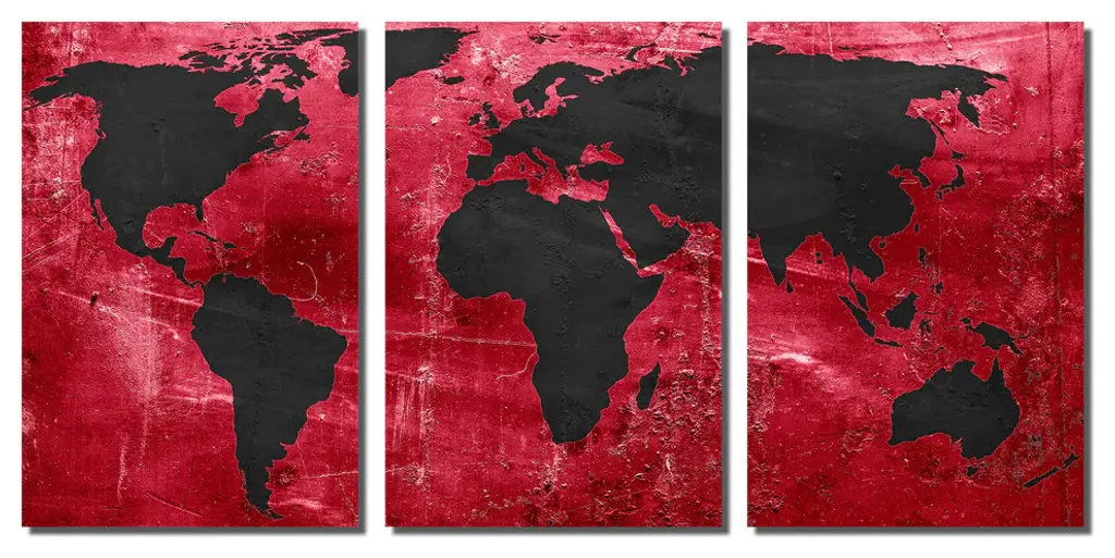 48"œ x 24"œ total size. Ready To Hang! (3 pieces - 16"œ x 24"œ each). 3 Panel Split (Triptych) Abstract art World Map Metal Print ft. shades of deep red and black colors. Modern metal wall art for home or office wall decor & interior design. Printed on Luxurious, HD aluminum glossy metal panels. Multi panel art.. HD aluminum panels. Metal print wall art. Includes Shadow Wall Mount on the back.• Aluminum Metal Wall Art• Made in USA• Ready to hang - No assembly required• Shadow mount hardware on the back• 0.045"œ thick HD Aluminum Panels• Scratch resistant, glossy finish• Superb color clarity, luxurious prints• Epson printing process• For indoor or moisture rich environment use• Easy to clean. Gently wipe with microfiber cloth.