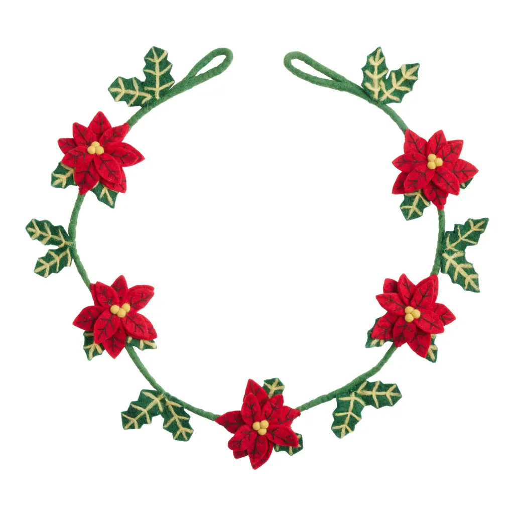Classic Christmas botanicals are reimagined in cozy, homespun style in our gorgeous green garland, featuring five red poinsettias accented with holly leaves. This intricately layered and richly textured holiday hanging decor is inspired by exclusive World Market artwork and handcrafted of New Zealand wool by Fair Trade artisans in Nepal.