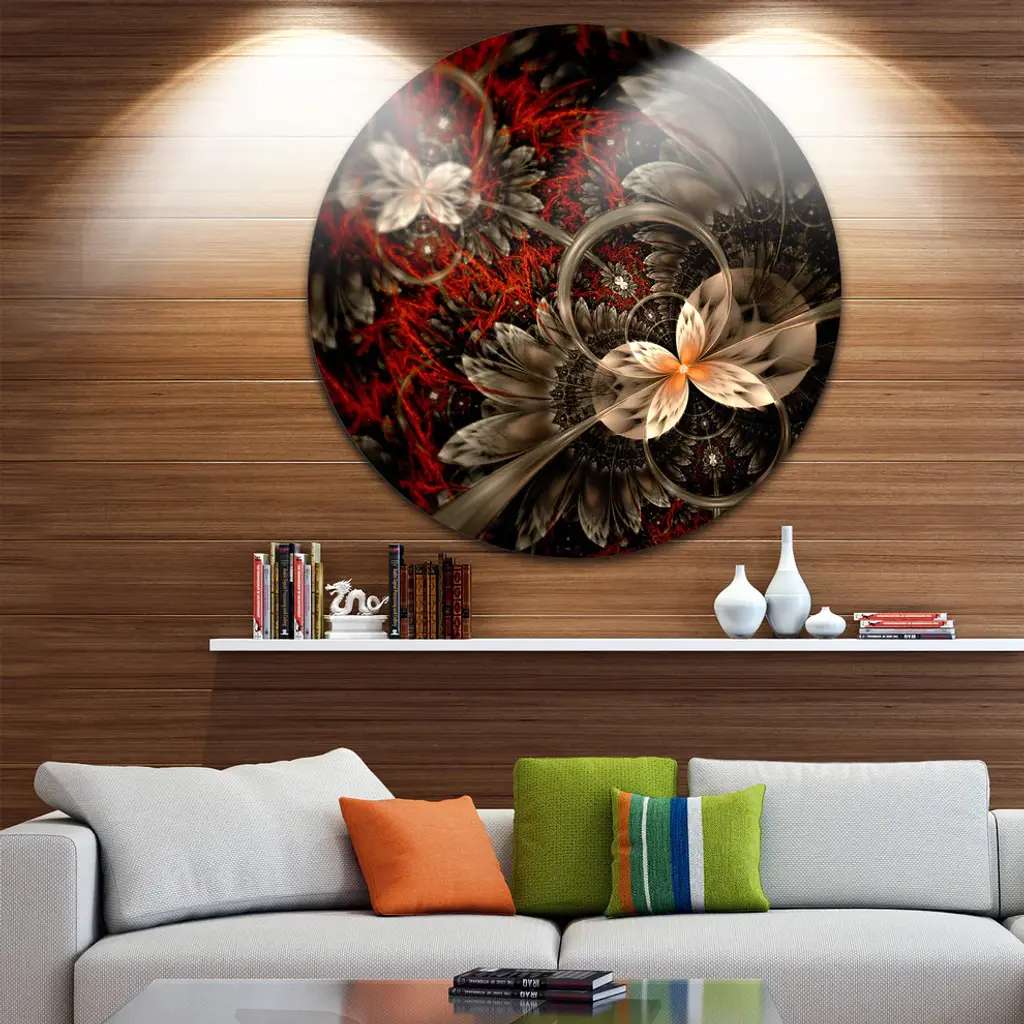 Bring Contemporary Abstraction to your home with this large Circle Metal wall art. This Red and Orange Fractal Flower Pattern Metal Artwork makes it the focal point of any room or office. - White Gloss Coating ensures colors are extra vibrant with light reflection.- Aluminum grade Sheet Metal with 1 inch mounting frame on the back giving the illusion that the artwork is floating on the wall..- Mounting Brackets are included along with instructions.- High Quality Digital images are created directly into a glossy aluminum panel producing a stunning and captivating print into the glossy finish of the metal.- Water, Fire and Scratch resistant HD Aluminum panels.- Looks better than any photo paper and guaranteed to last at least 20 years- Easy to clean with a microfiber cloth. Colors are far superior to regular Canvas Art. - Easy to Hang