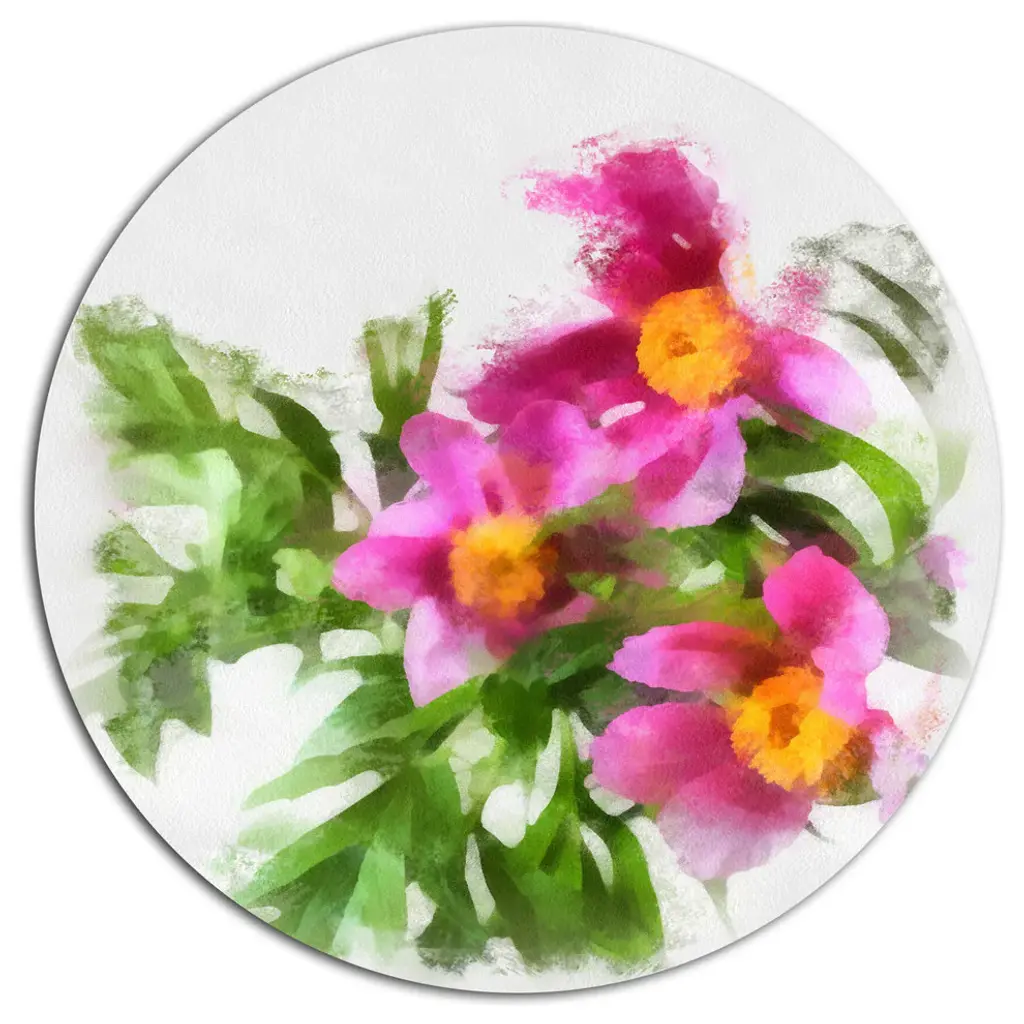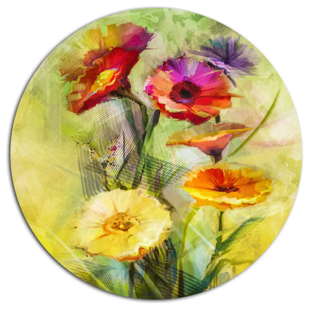 Bring Contemporary Abstraction to your home with this large Circle Metal wall art. This Red and Pink Flowers on Green Metal Artwork makes it the focal point of any room or office. - White Gloss Coating ensures colors are extra vibrant with light reflection.- Aluminum grade Sheet Metal with 1 inch mounting frame on the back giving the illusion that the artwork is floating on the wall..- Mounting Brackets are included along with instructions.- High Quality Digital images are created directly into a glossy aluminum panel producing a stunning and captivating print into the glossy finish of the metal.- Water, Fire and Scratch resistant HD Aluminum panels.- Looks better than any photo paper and guaranteed to last at least 20 years- Easy to clean with a microfiber cloth. Colors are far superior to regular Canvas Art. - Easy to Hang