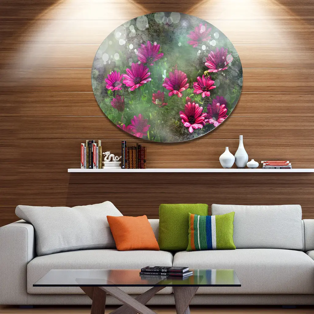 Bring Contemporary Abstraction to your home with this large Circle Metal wall art. This Red and Pink Flowers on Green Metal Artwork makes it the focal point of any room or office. - White Gloss Coating ensures colors are extra vibrant with light reflection.- Aluminum grade Sheet Metal with 1 inch mounting frame on the back giving the illusion that the artwork is floating on the wall..- Mounting Brackets are included along with instructions.- High Quality Digital images are created directly into a glossy aluminum panel producing a stunning and captivating print into the glossy finish of the metal.- Water, Fire and Scratch resistant HD Aluminum panels.- Looks better than any photo paper and guaranteed to last at least 20 years- Easy to clean with a microfiber cloth. Colors are far superior to regular Canvas Art. - Easy to Hang