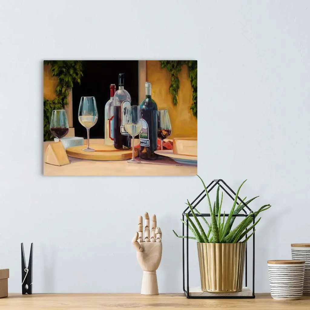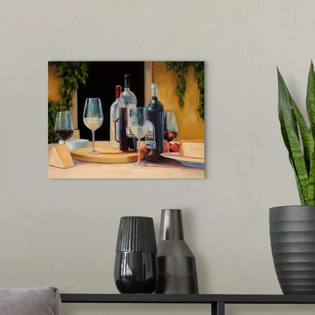 Contemporary still life painting of bottles and glasses of wine with cheese wedges on a table in a village setting.