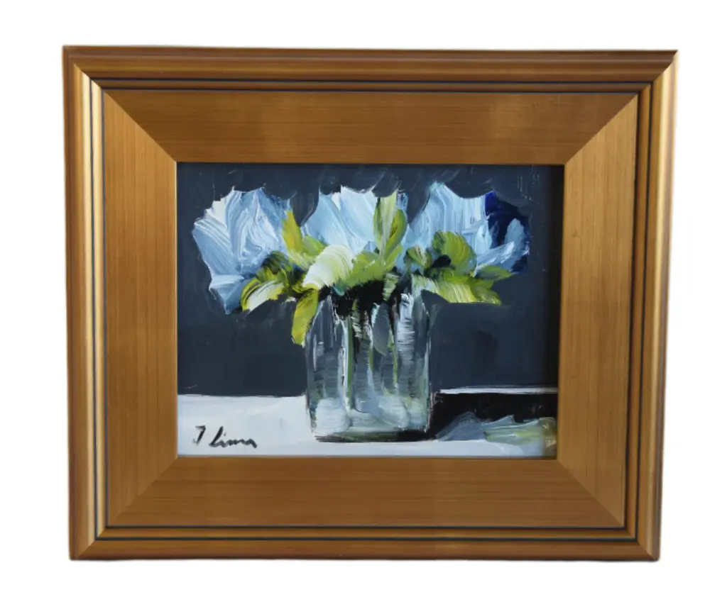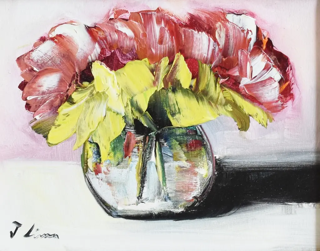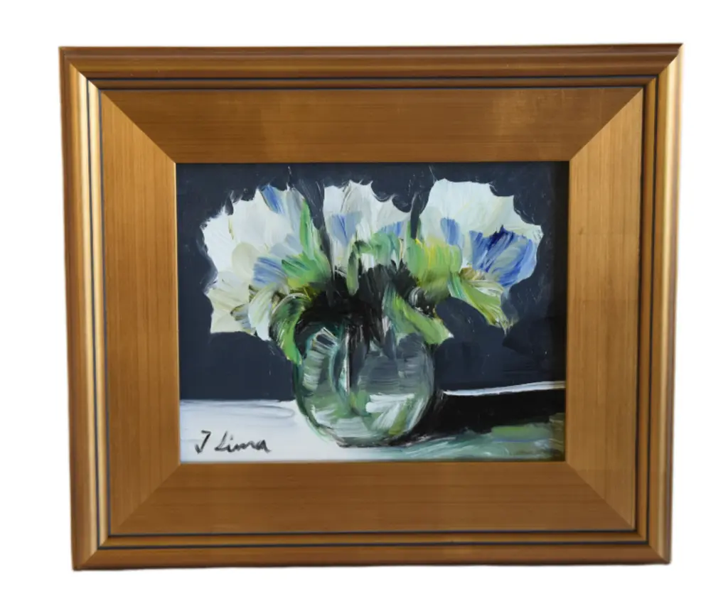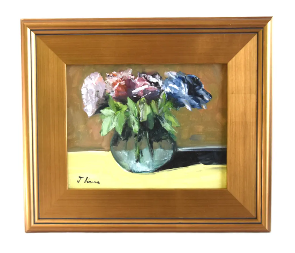Impressionist abstract bouquet of red & yellow flowers in a vase oil painting on stretched artist canvas. Signed by the talented artist ��J Lima����������� in the lower left corner. Also signed on the reverse. Included are the beautifully antiqued gold wood frame and hanging hardware/wire. Dimensions: Artwork, 10”L x 8’���H; overall, including the frame, 16.25���L x 14.25���H. Excellent beautiful condition!!!