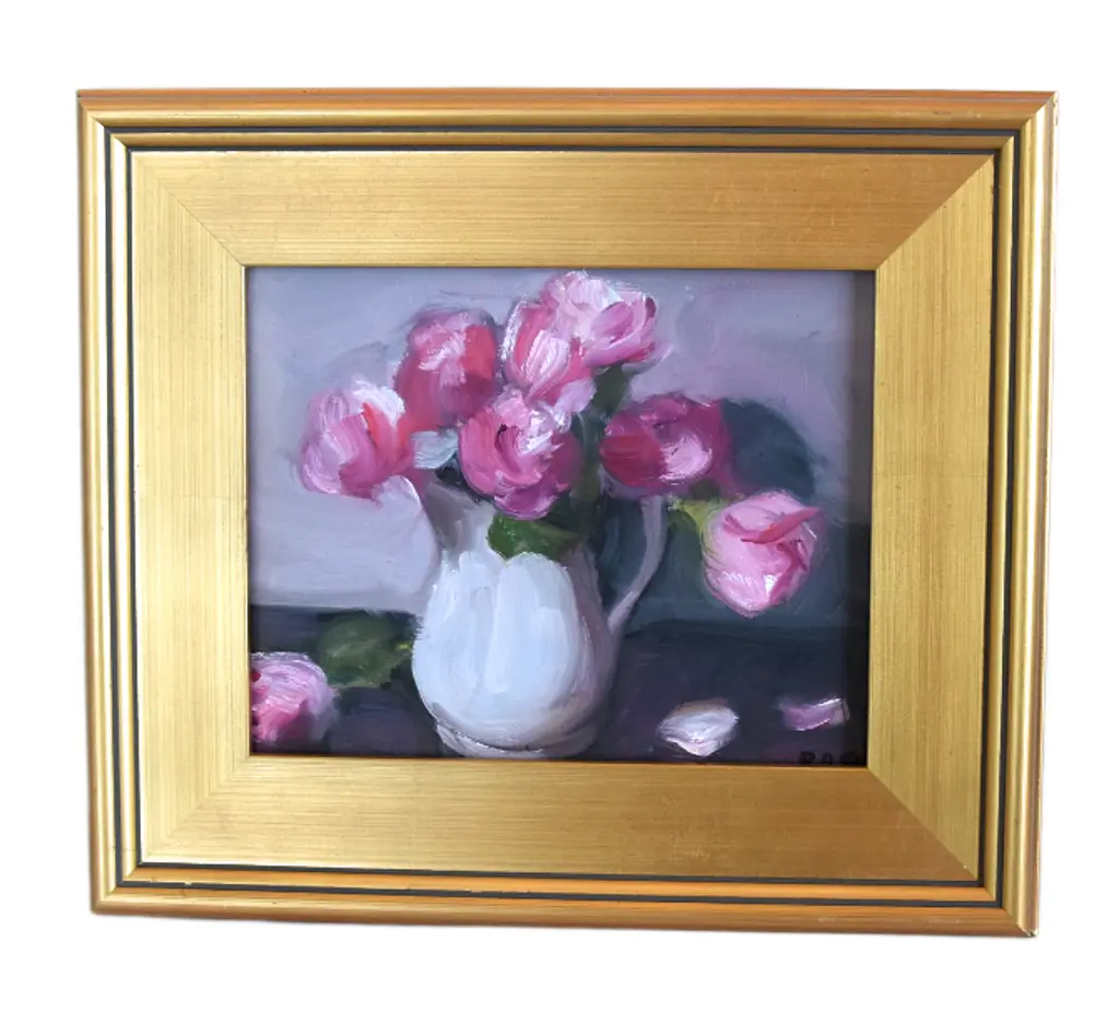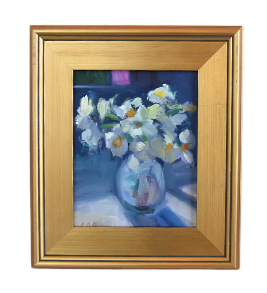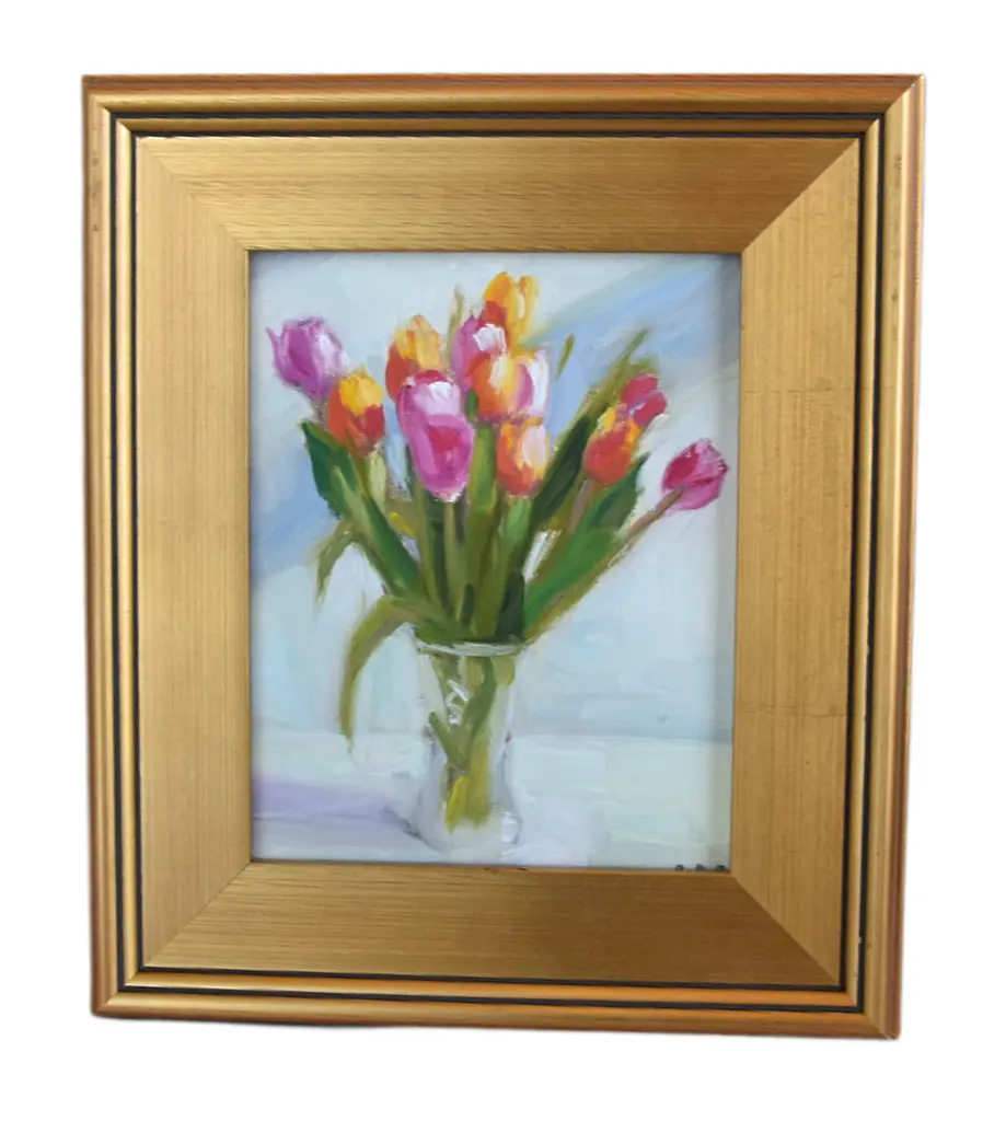 Impressionist abstract bouquet of red & yellow flowers in a vase oil painting on stretched artist canvas. Signed by the talented artist ��J Lima����������� in the lower left corner. Also signed on the reverse. Included are the beautifully antiqued gold wood frame and hanging hardware/wire. Dimensions: Artwork, 10”L x 8’���H; overall, including the frame, 16.25���L x 14.25���H. Excellent beautiful condition!!!