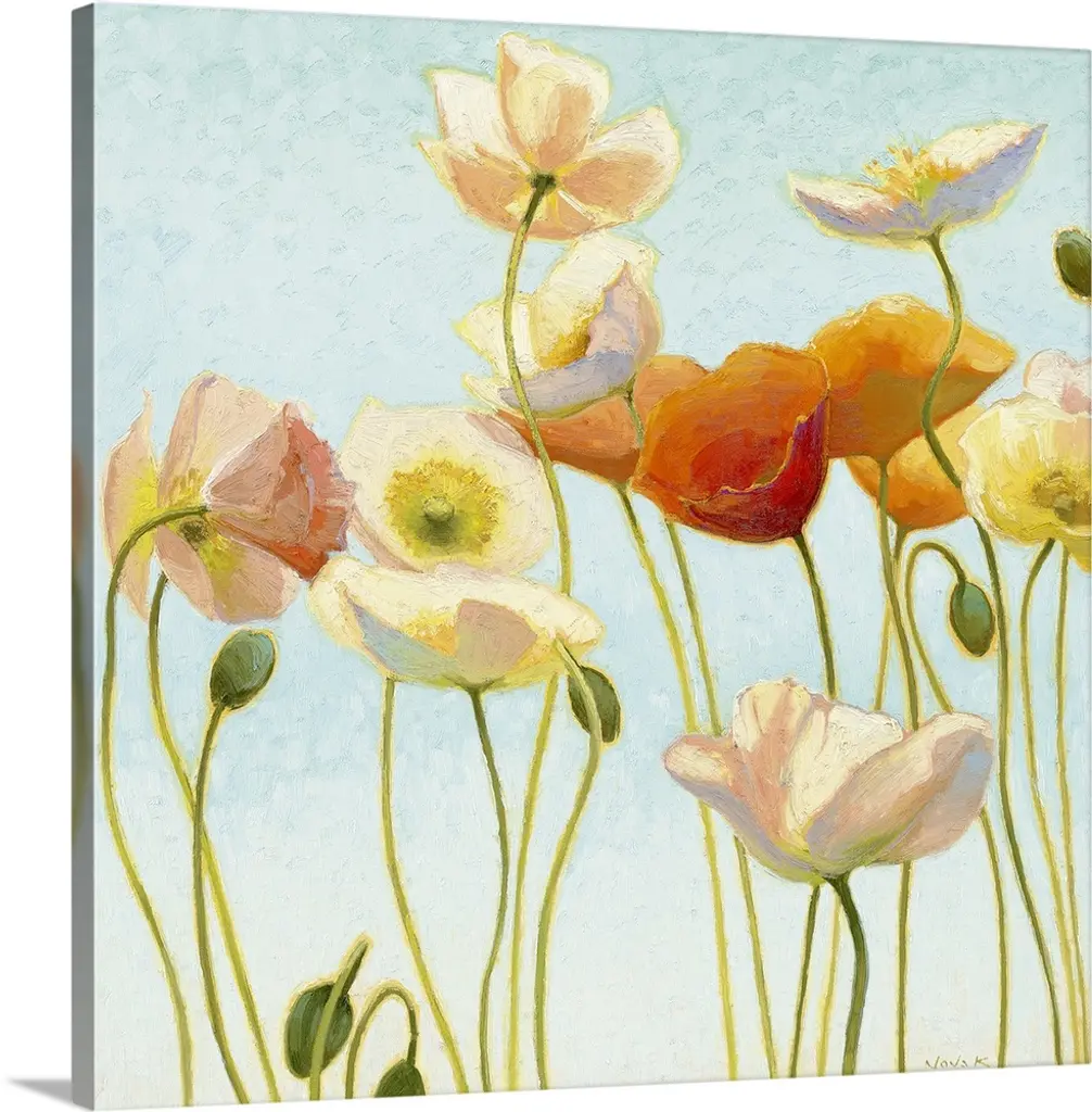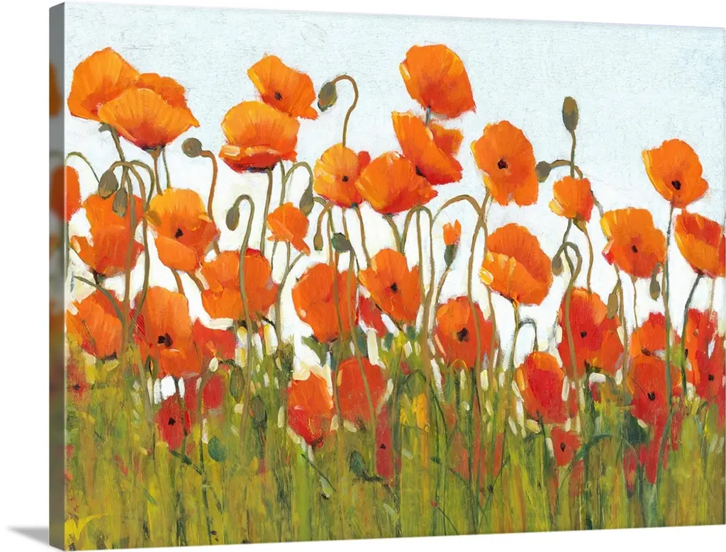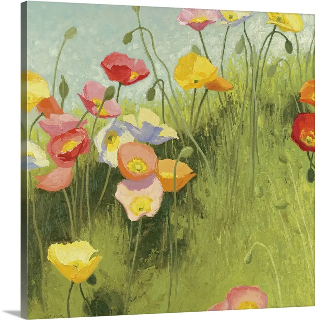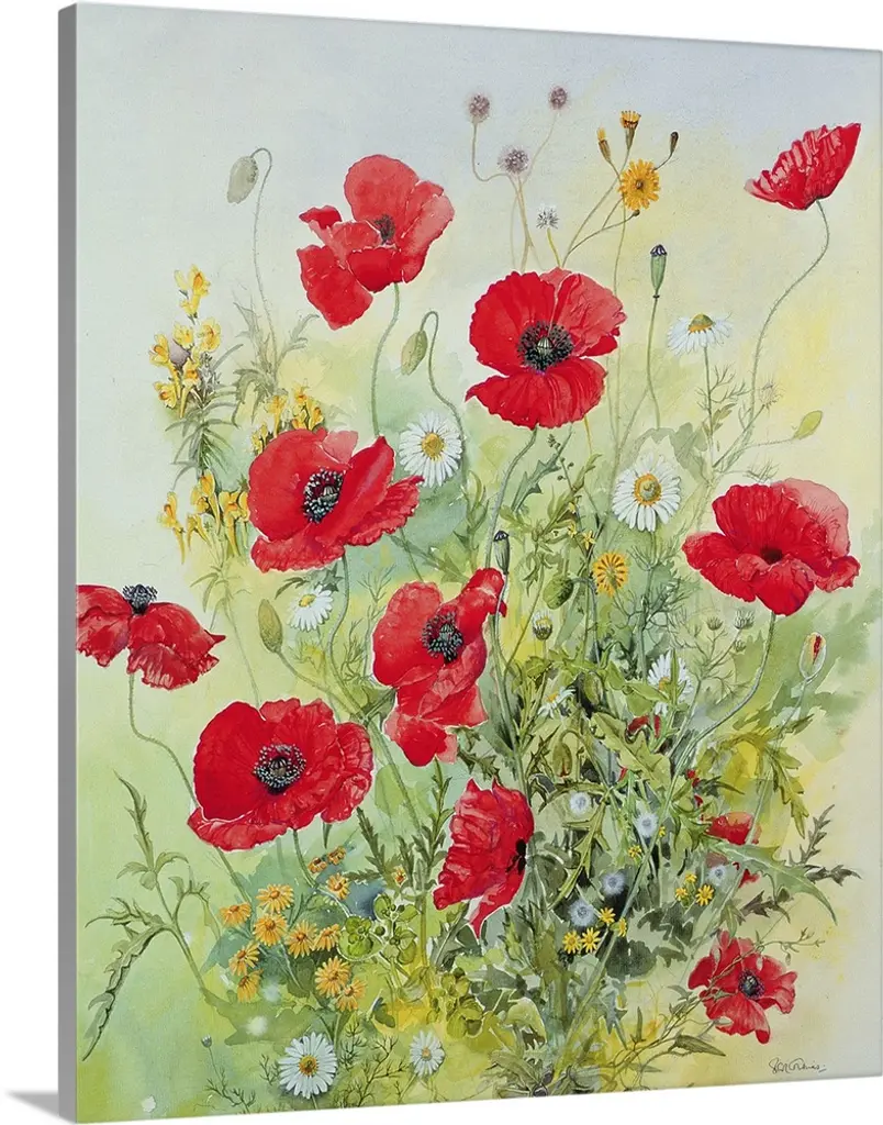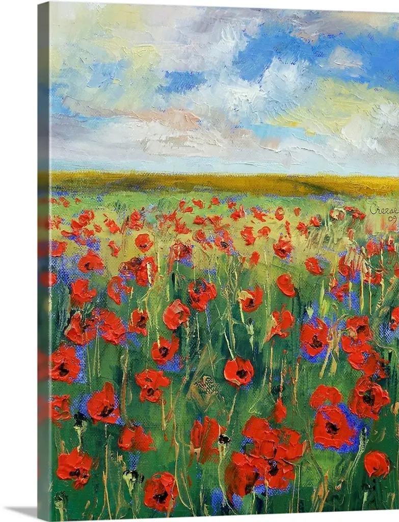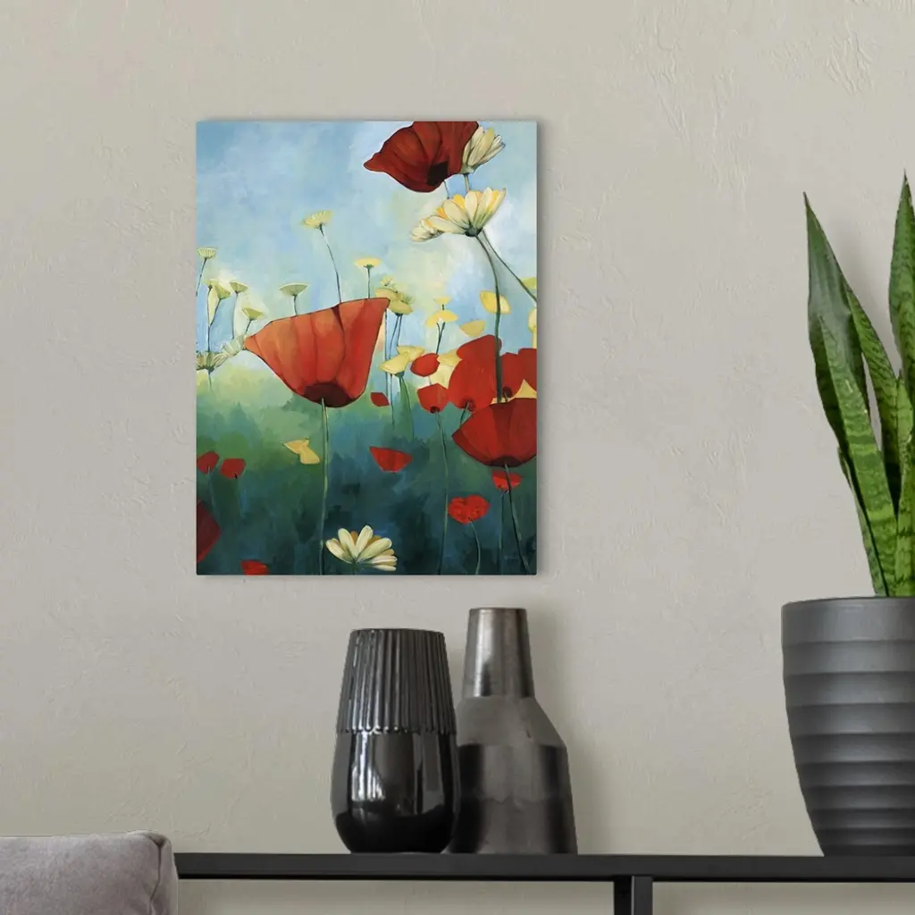 Contemporary painting of red poppies in a green field with daisies, under a blue sky.