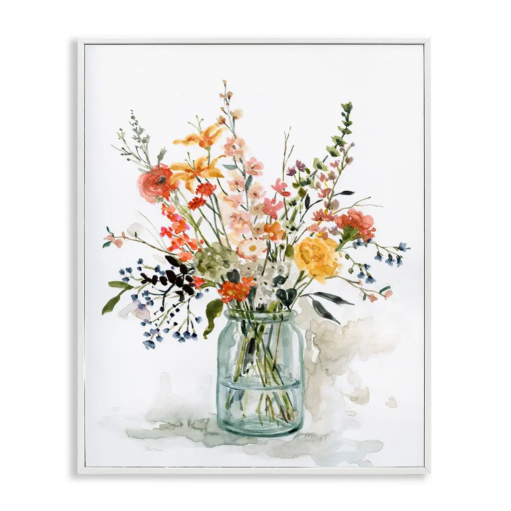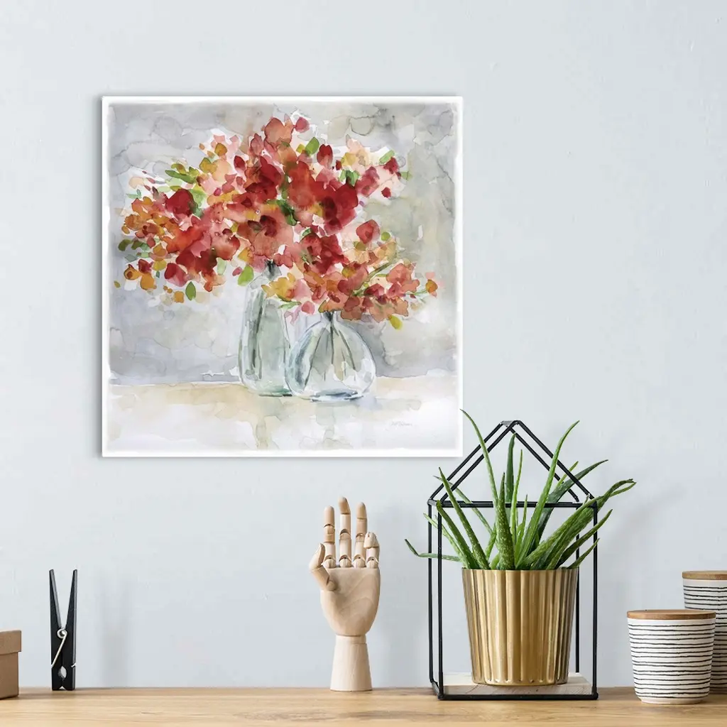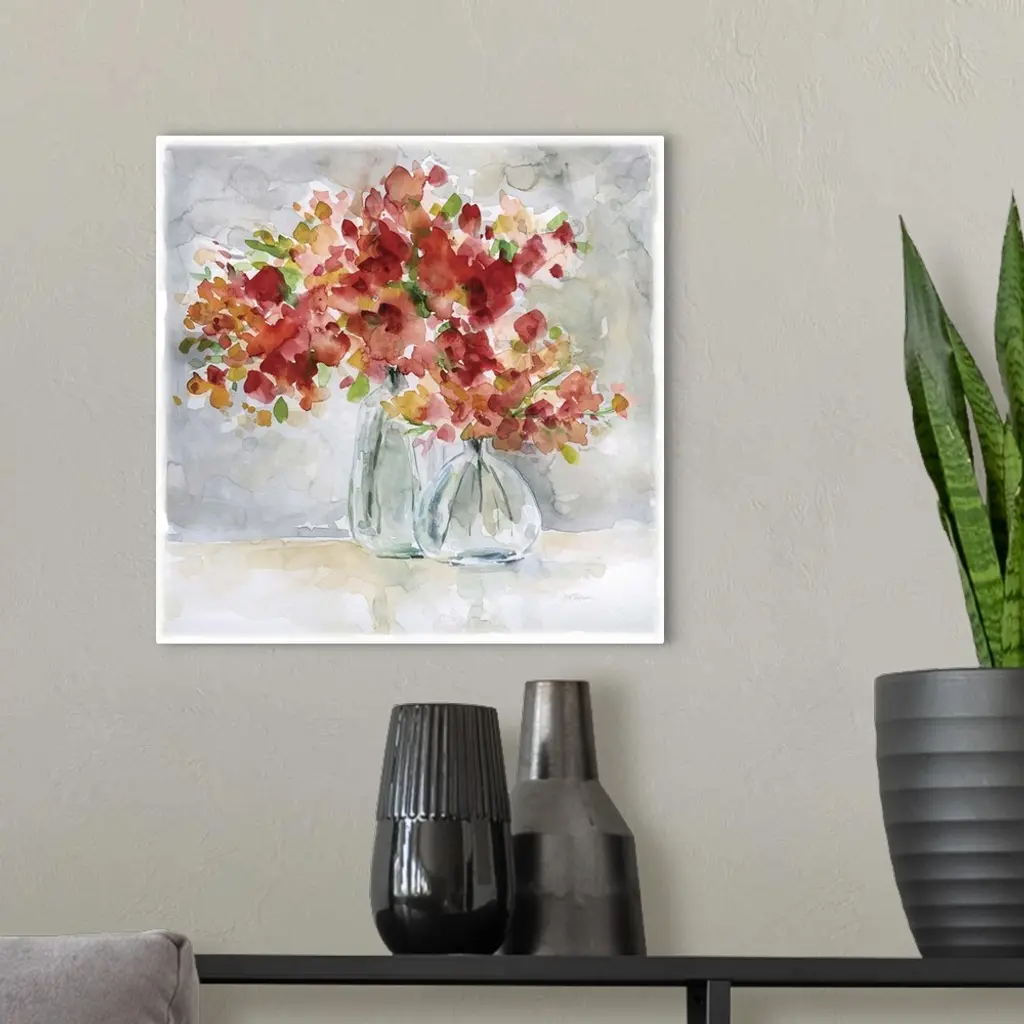 Beautiful square watercolor painting of red and orange flowers in glass vases on a gray and tan background.