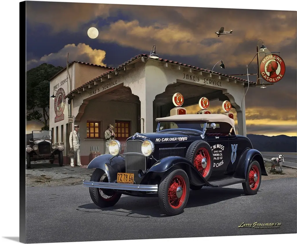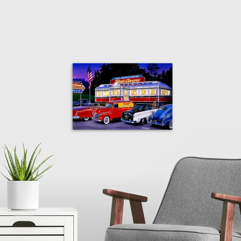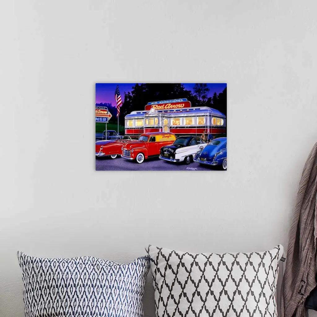 Horizontal artwork on a large canvas of an old style trolley car diner in the early 1950s, lit up at night. Parked out front are a 1953 Cadillac, 1949 Ford police car, 1948 Oldsmobile Fastback, 1948 GMC panel truck.