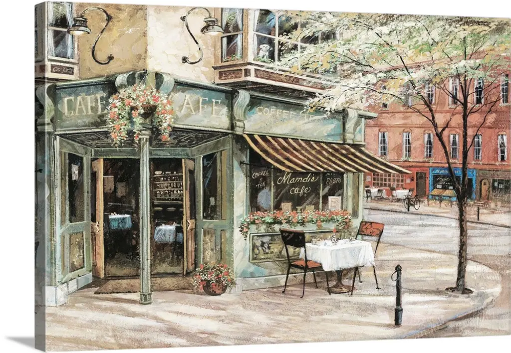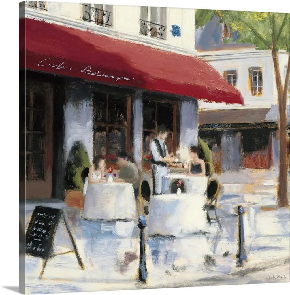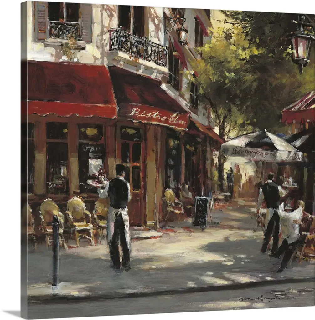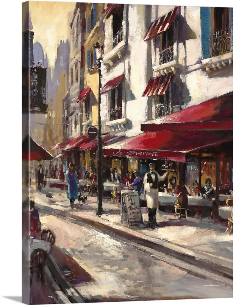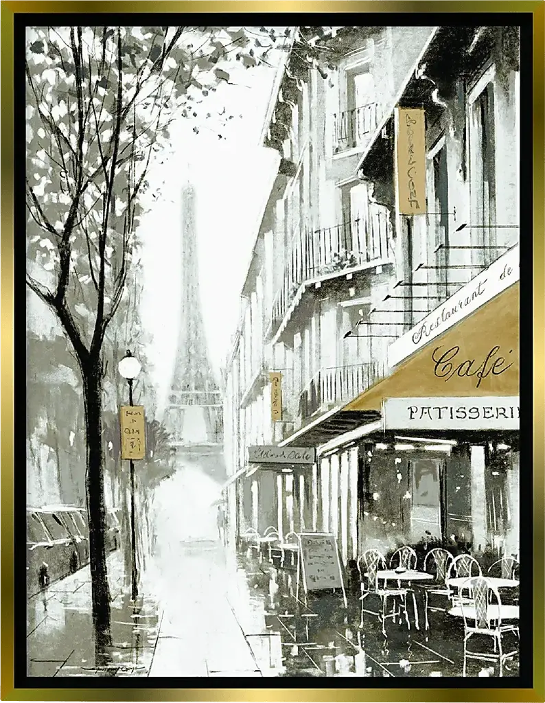 Painting of a street scene in Paris, France, near an outdoor cafe.