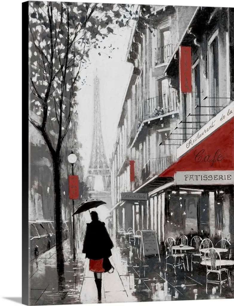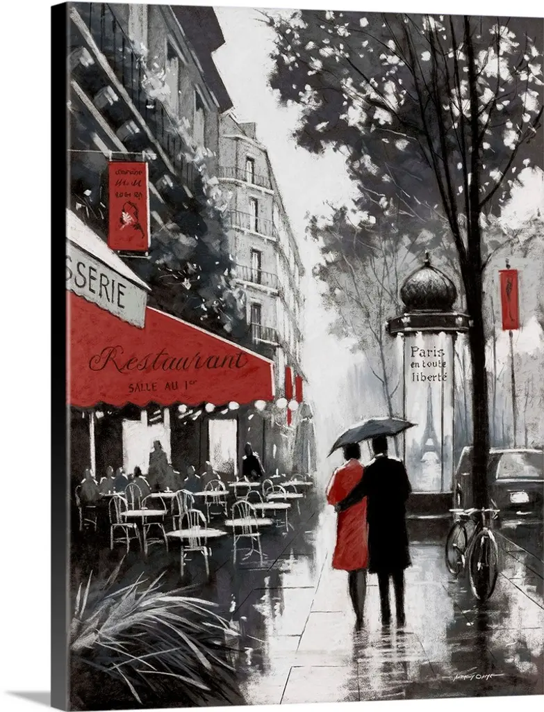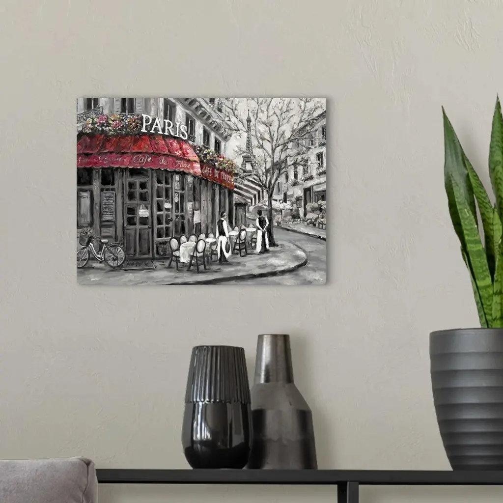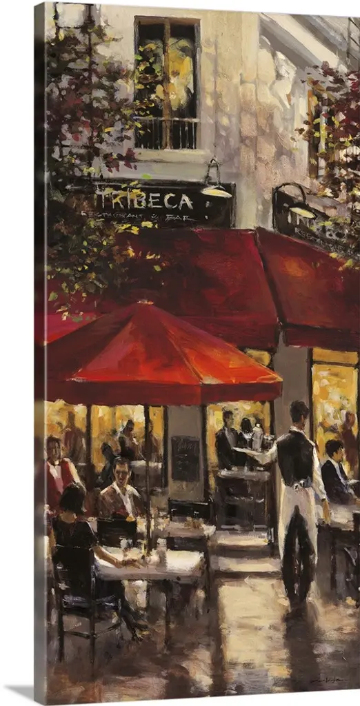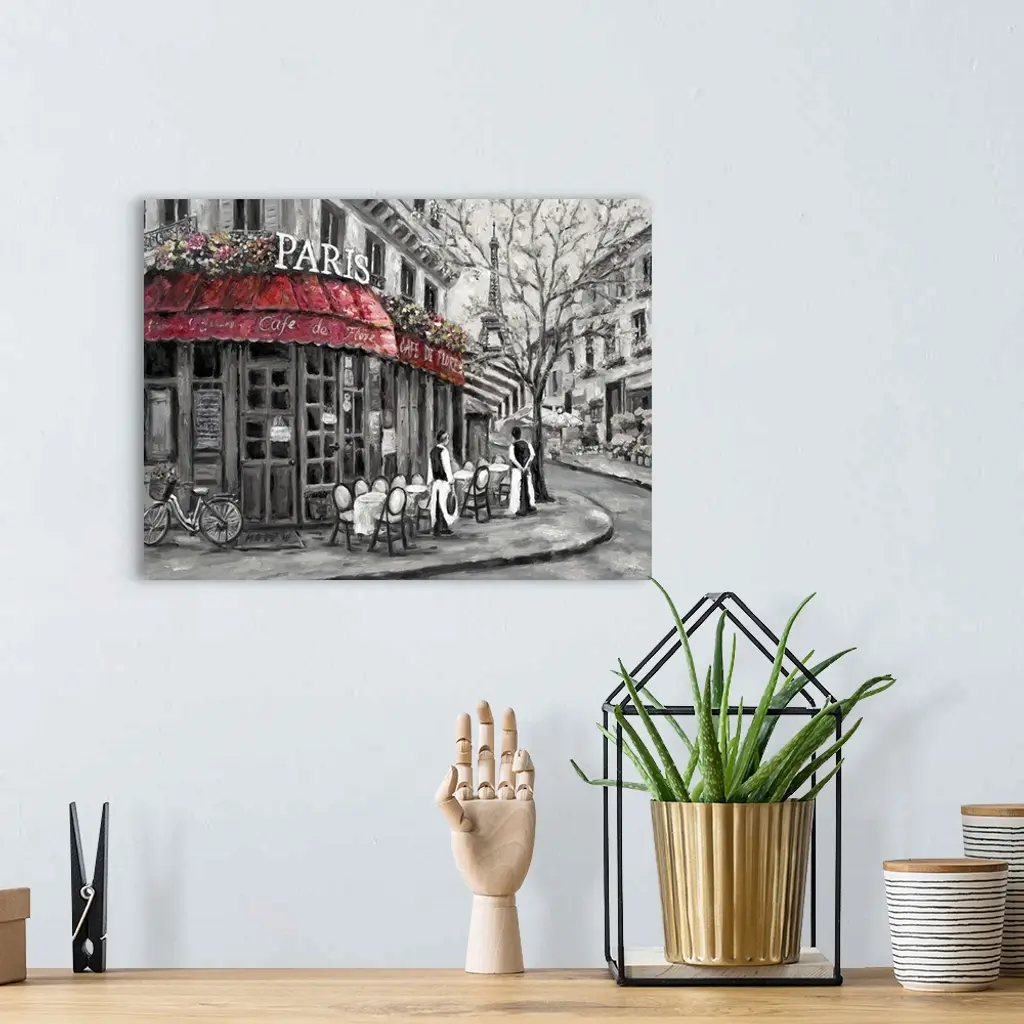Painting of a street scene in Paris, France, near an outdoor cafe.