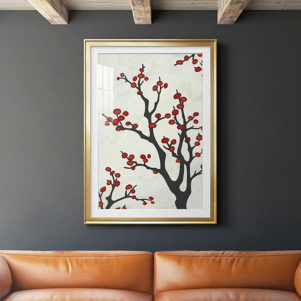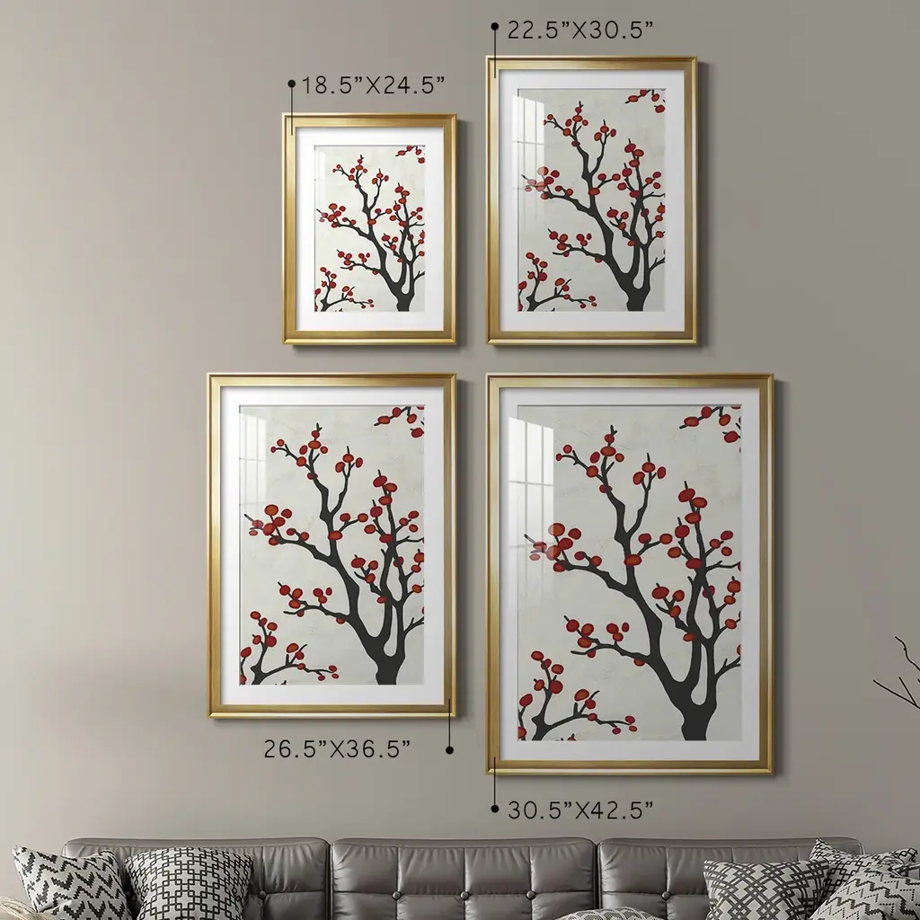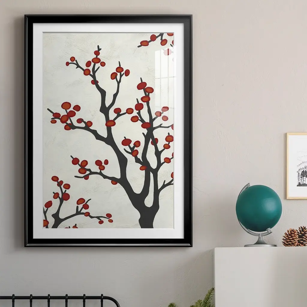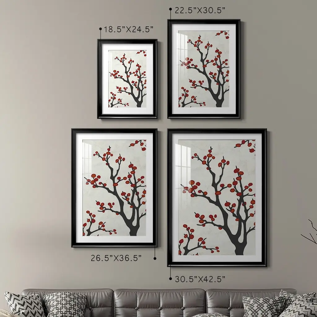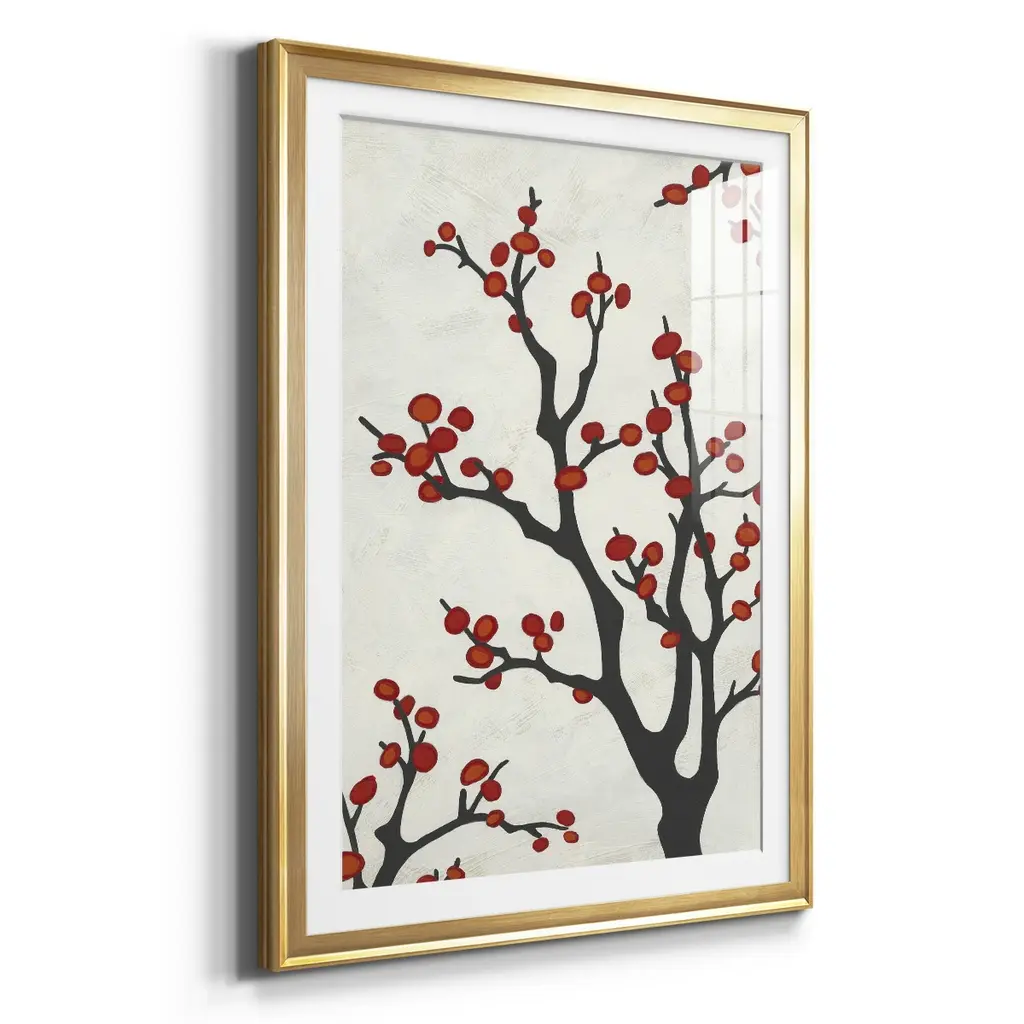 Red Berry Branch II Premium Framed Print - Ready to Hang A Premium Framed Print created to last. Framed in distressed wood and available in an array of sizes and colors Featuring a beveled a solid wood stretcher bar, each piece comes ready to hand 4 SIZES AVAILABLE 30.5''X42.5'' - Overall Size 26.5'X36.5'' - Overall Size 22.5''x30.5'' - Overall Size 18.5''x24.5'' - Overall Size Each piece is made to order. Each piece comes with hanging hardware. Made in the USA Ready to Hang Giclee Paper Print Acrylic Glass Beveled Matt Board