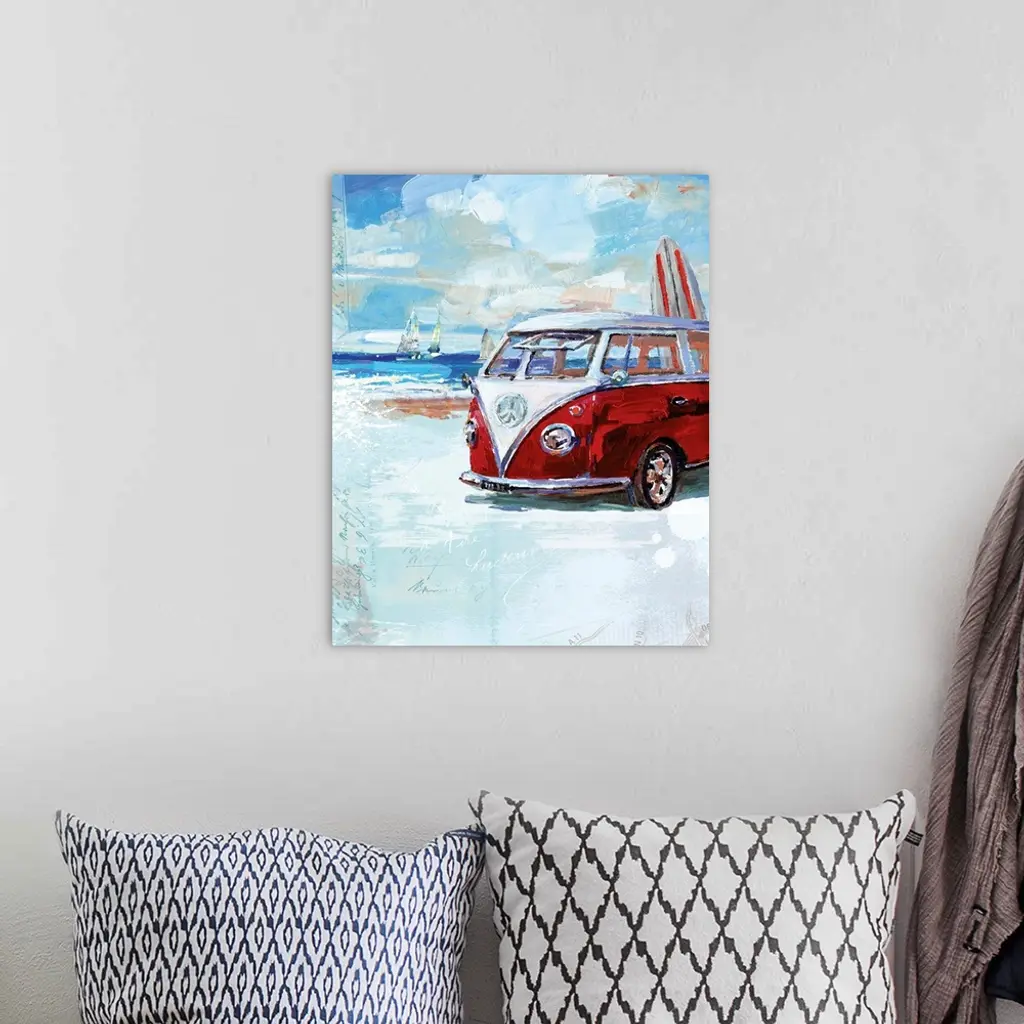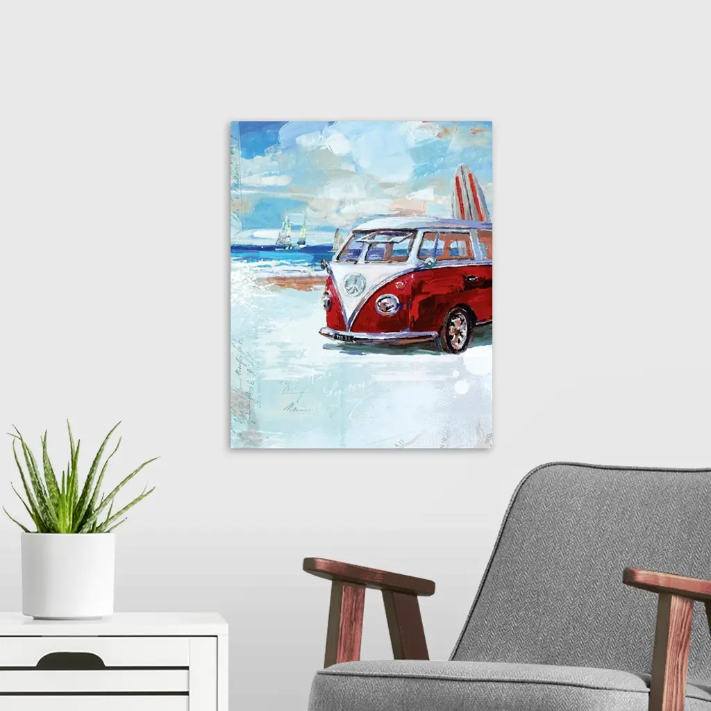 A painting of a Volkswagen van with expressive brushstrokes and subtle layers of map text and handwritten notes.