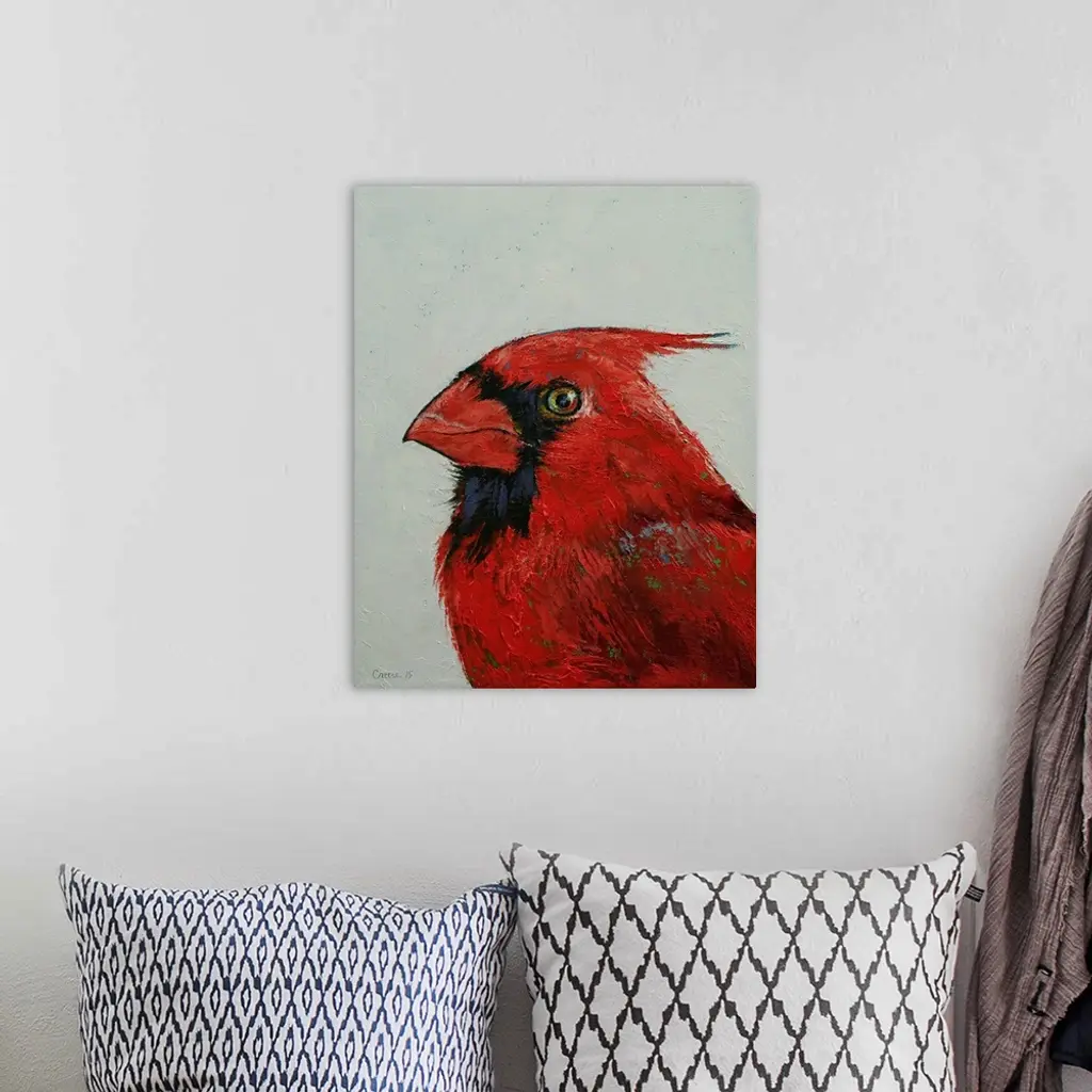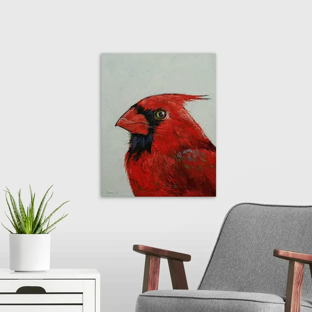 A contemporary painting of close-up portrait of a striking red cardinal.