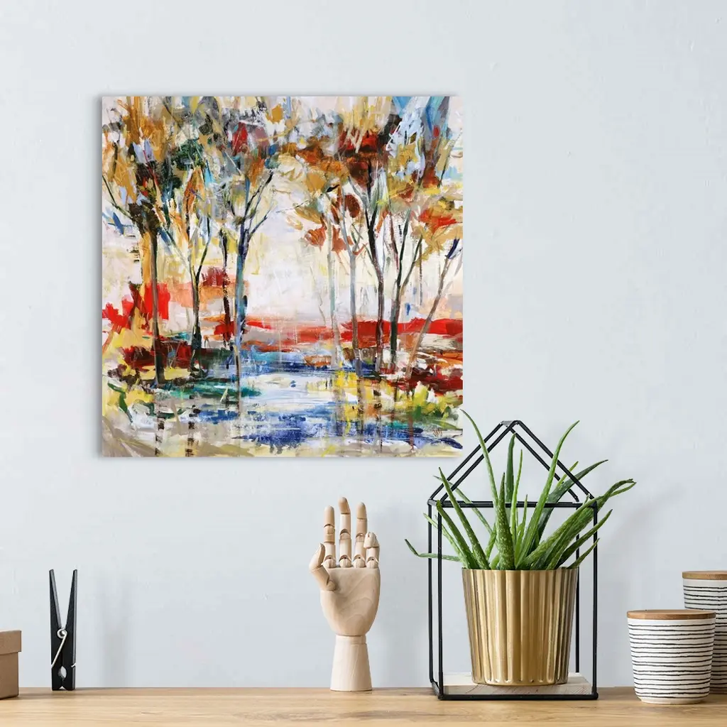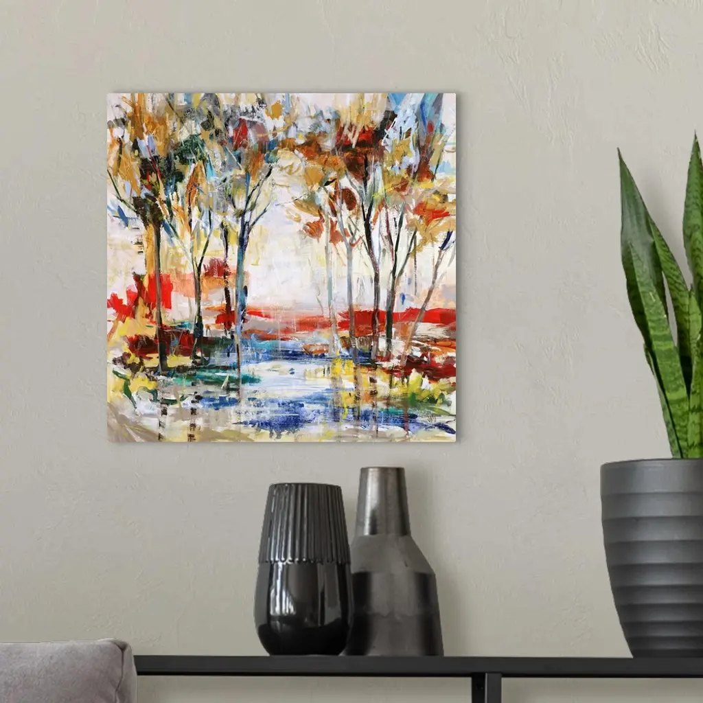 Contemporary painting of a grove of vibrant trees, surrounded by a multicolored playful landscape.