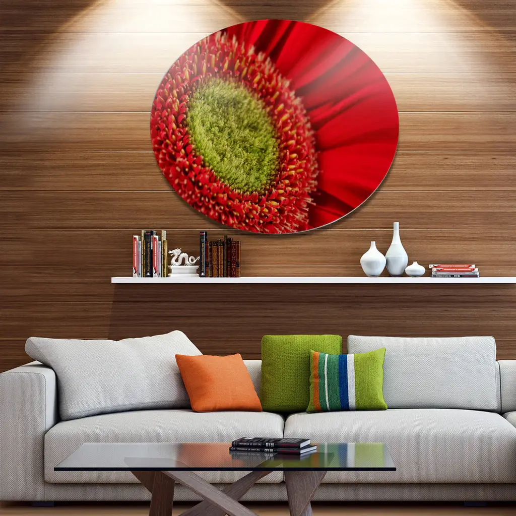 Bring Contemporary Abstraction to your home with this large Circle Metal wall art. This Red Daisy Gerbera Flower Close-Up Metal Artwork makes it the focal point of any room or office. - White Gloss Coating ensures colors are extra vibrant with light reflection.- Aluminum grade Sheet Metal with 1 inch mounting frame on the back giving the illusion that the artwork is floating on the wall..- Mounting Brackets are included along with instructions.- High Quality Digital images are created directly into a glossy aluminum panel producing a stunning and captivating print into the glossy finish of the metal.- Water, Fire and Scratch resistant HD Aluminum panels.- Looks better than any photo paper and guaranteed to last at least 20 years- Easy to clean with a microfiber cloth. Colors are far superior to regular Canvas Art. - Easy to Hang