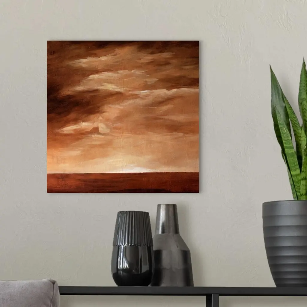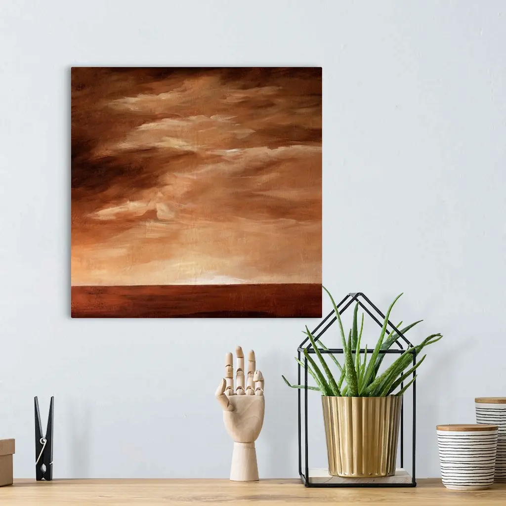 The sun rises over the water on the eastern horizon and illuminates the clouds above in this contemporary painting.