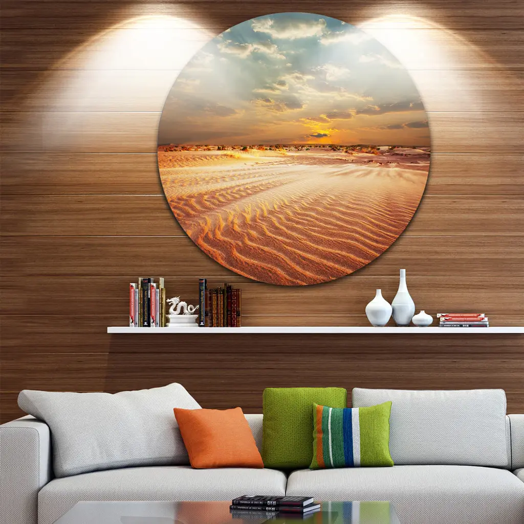 Bring Contemporary Abstraction to your home with this large Circle Metal wall art. This Red Desert under Blue Cloudy Skies Metal Artwork makes it the focal point of any room or office. - White Gloss Coating ensures colors are extra vibrant with light reflection.- Aluminum grade Sheet Metal with 1 inch mounting frame on the back giving the illusion that the artwork is floating on the wall..- Mounting Brackets are included along with instructions.- High Quality Digital images are created directly into a glossy aluminum panel producing a stunning and captivating print into the glossy finish of the metal.- Water, Fire and Scratch resistant HD Aluminum panels.- Looks better than any photo paper and guaranteed to last at least 20 years- Easy to clean with a microfiber cloth. Colors are far superior to regular Canvas Art. - Easy to Hang