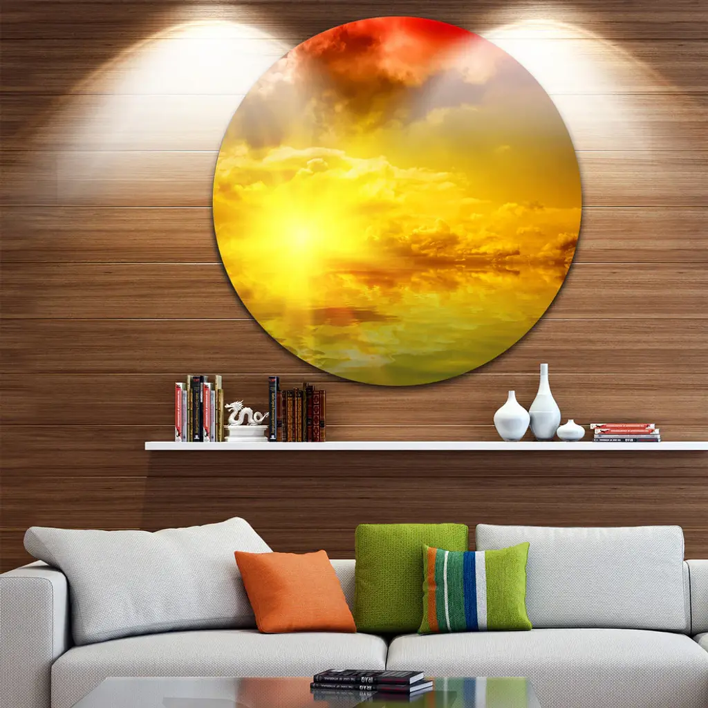Bring Contemporary Abstraction to your home with this large Circle Metal wall art. This Red Dramatic Sky with Yellow Sun Metal Artwork makes it the focal point of any room or office. - White Gloss Coating ensures colors are extra vibrant with light reflection.- Aluminum grade Sheet Metal with 1 inch mounting frame on the back giving the illusion that the artwork is floating on the wall..- Mounting Brackets are included along with instructions.- High Quality Digital images are created directly into a glossy aluminum panel producing a stunning and captivating print into the glossy finish of the metal.- Water, Fire and Scratch resistant HD Aluminum panels.- Looks better than any photo paper and guaranteed to last at least 20 years- Easy to clean with a microfiber cloth. Colors are far superior to regular Canvas Art. - Easy to Hang