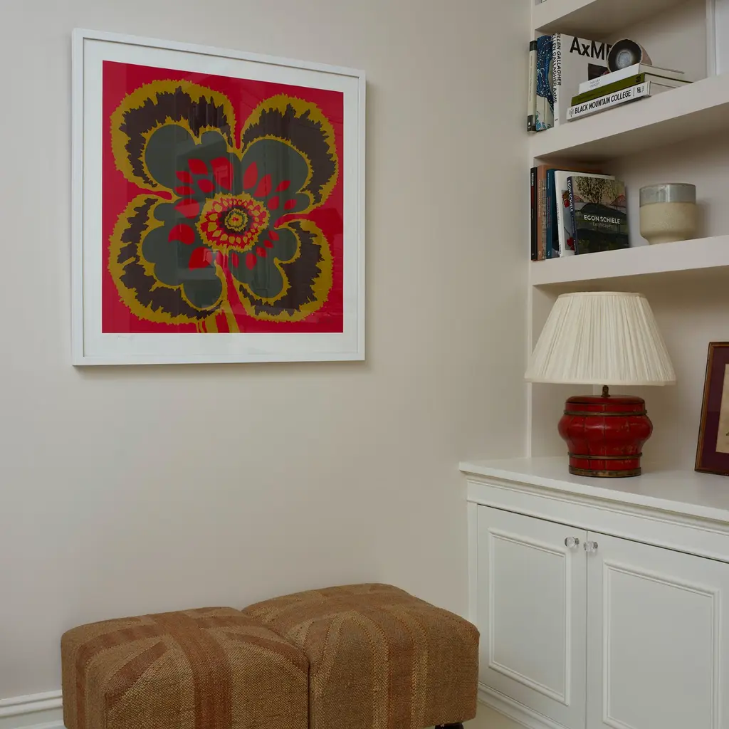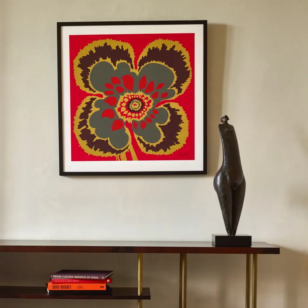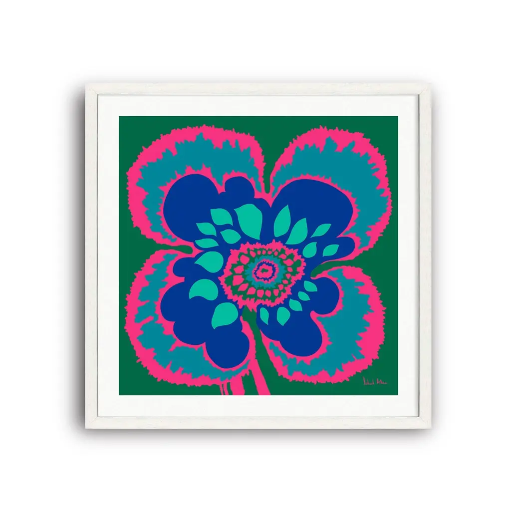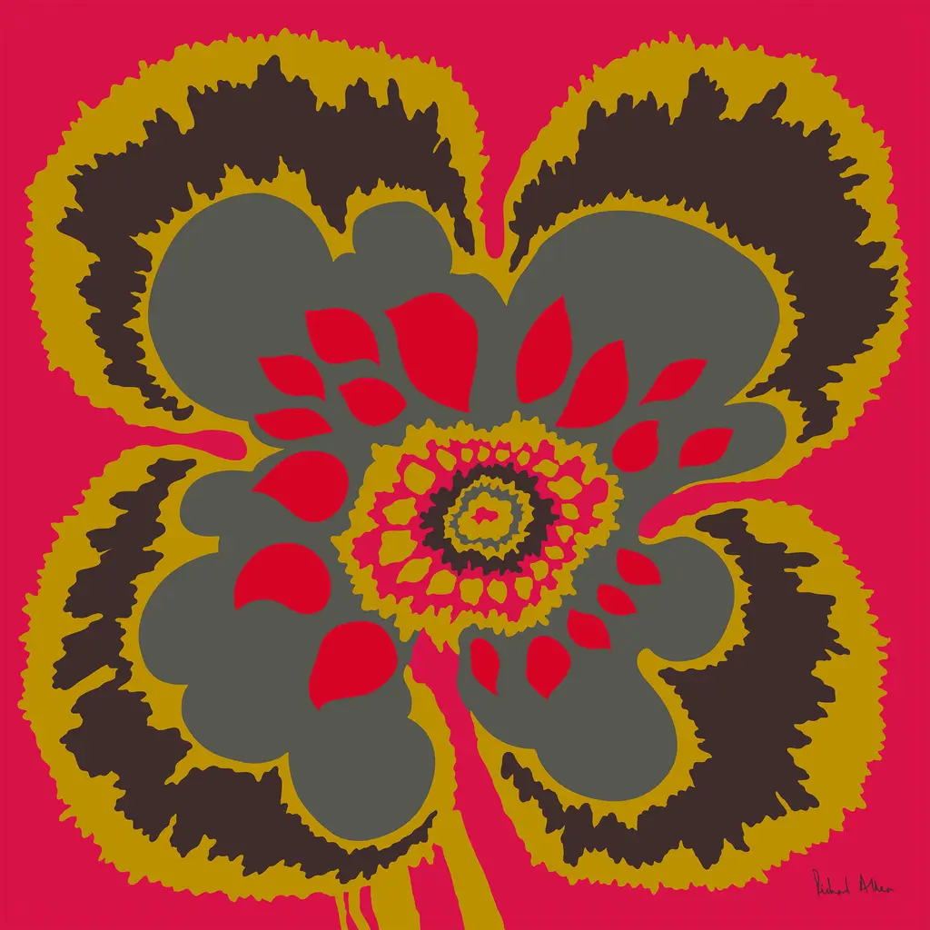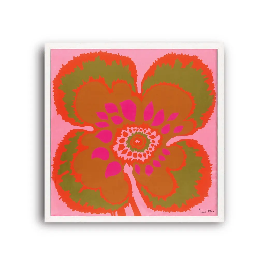Joyful, pure and simple. A salute to Elsa Schiaparelli, with whom Richard Allan collaborated, an abstract floral, a touch of shocking pink, a ‘dare to be bold’ attitude and a celebration of colour.A limited edition print of 100, numbered and signed on museum etching paper, embossed with the Richard Allan London company seal. This design is a 1960s-70s original archive design from Richard Allan London and is made in England. Unframed