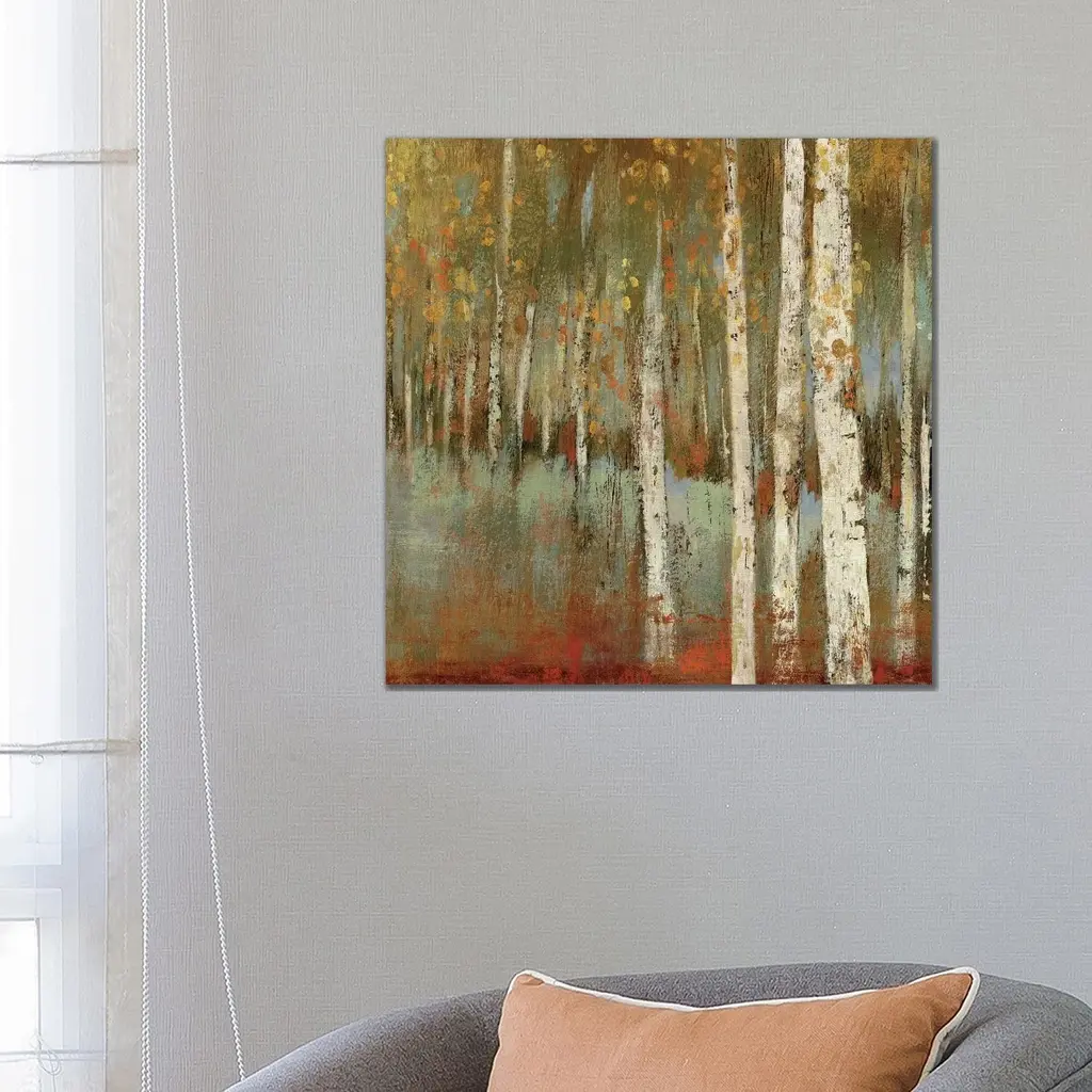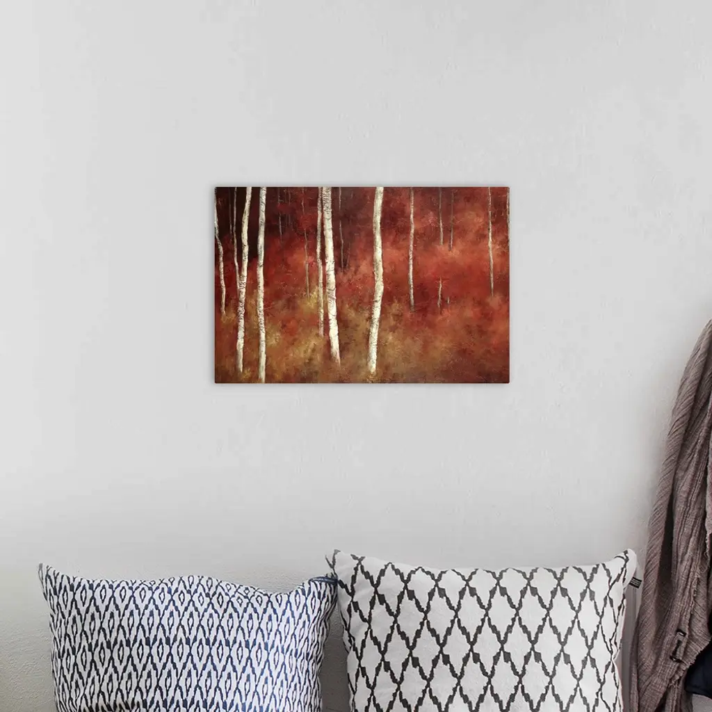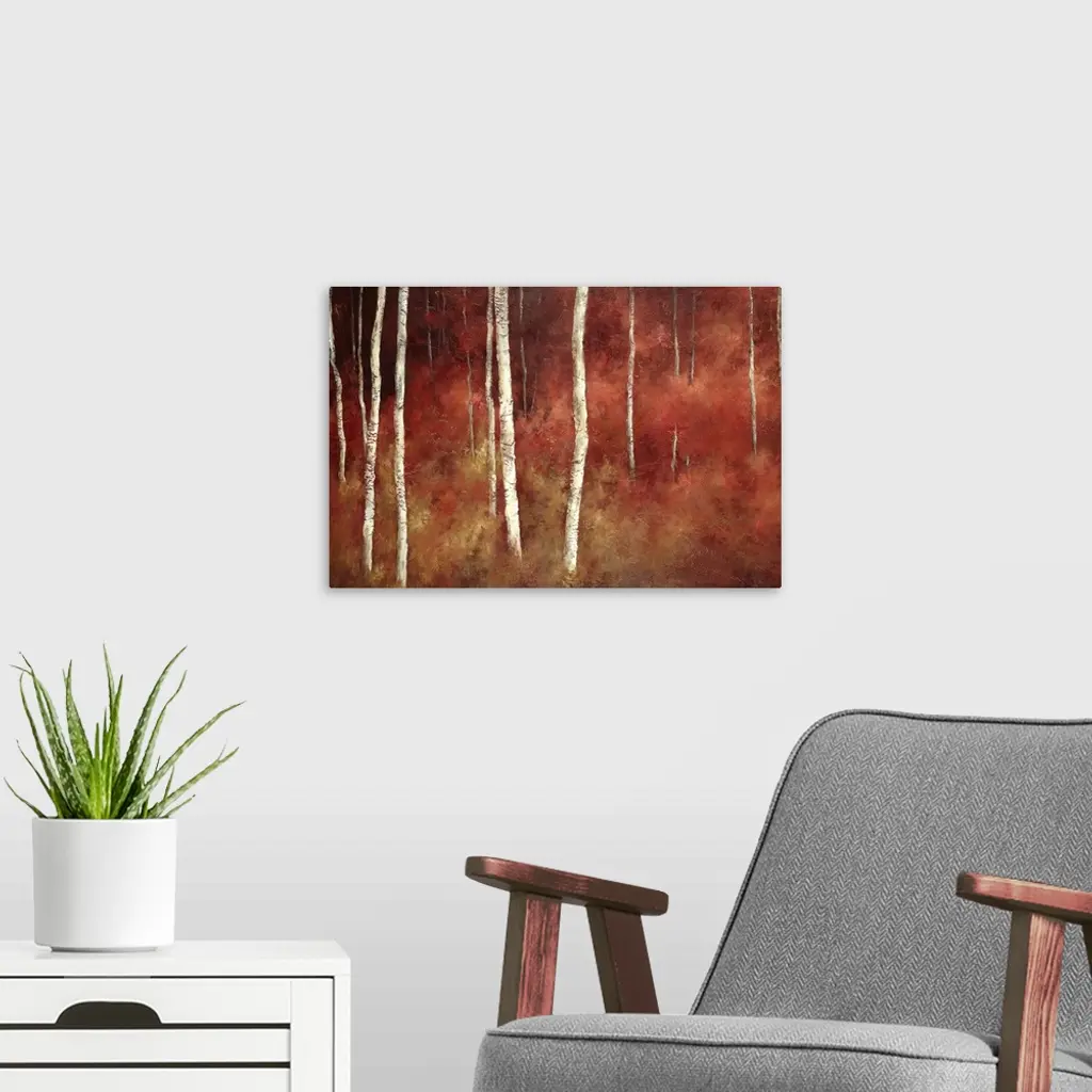 Giant, contemporary painting of thin white tree trunks in a forest surrounded with red and golden tones, making the forest appear as if it's on fire.