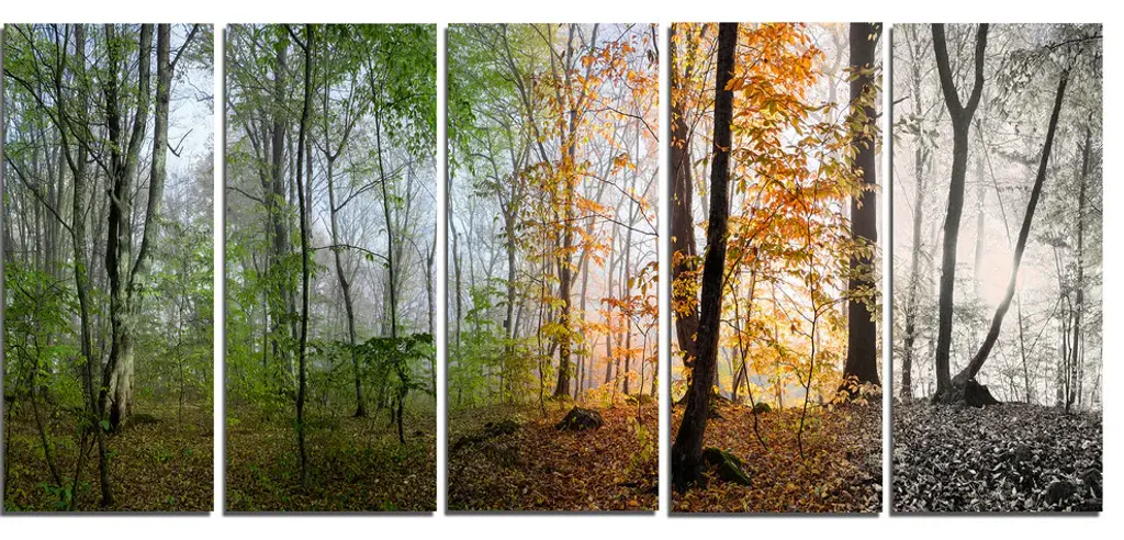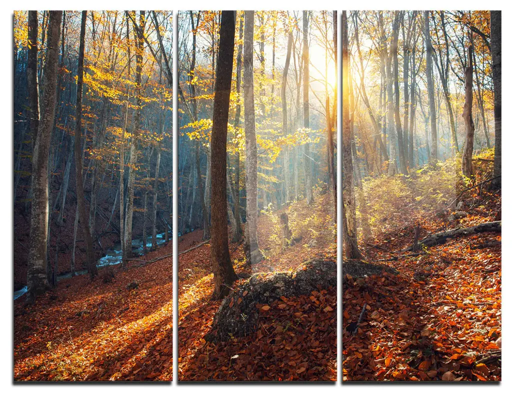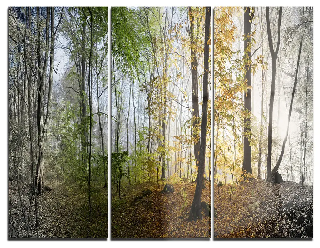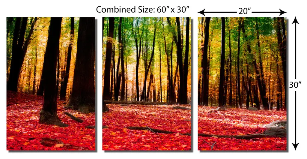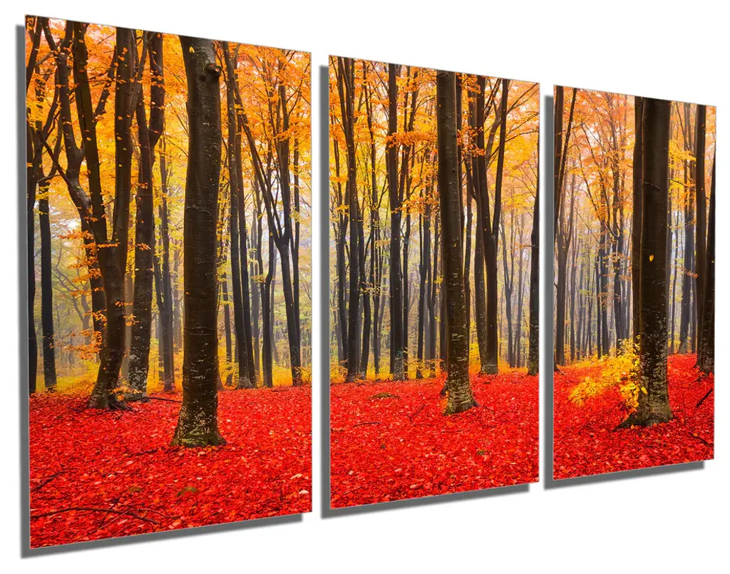 60"œ x 30"œ total size. Ready To Hang! (3 pieces - 20"œ x 30"œ each). 3 Panel Split (Triptych) Metal Print of Foggy autumn day in the forest with red, dark pink leafs. Modern metal wall art for home or office wall decor & interior design. Printed on Luxurious, HD aluminum glossy metal panels. Multi panel art.. HD aluminum panels. Metal print wall art. Includes Shadow Wall Mount on the back.• Aluminum Metal Wall Art• Made in USA• Ready to hang - No assembly required• Shadow mount hardware on the back• 0.045"œ thick HD Aluminum Panels• Scratch resistant, glossy finish• Superb color clarity, luxurious prints• Epson printing process• For indoor or moisture rich environment use• Easy to clean. Gently wipe with microfiber cloth.
